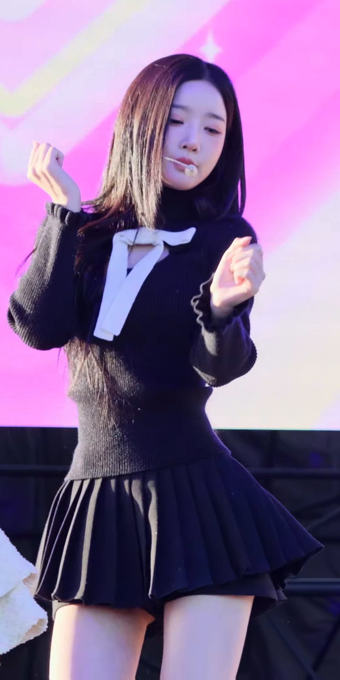 tripleS의 김유연은 블랙 니트 상의와 플리츠 미니 스커트를 매치하여 사랑스럽고 단정한 프레피룩을 선보입니다. 상의의 화이트 보우 디테일과 스커트의 깔끔한 주름이 전체적인 스쿨룩 분위기를 강조하며, 발랄하면서도 세련된 아이돌무대의상으로 연출하고 있습니다. 전체적으로 블랙 컬러를 사용하여 통일감을 주면서도, 상의의 보우 디테일로 포인트를 더해 시선을 사로잡습니다.