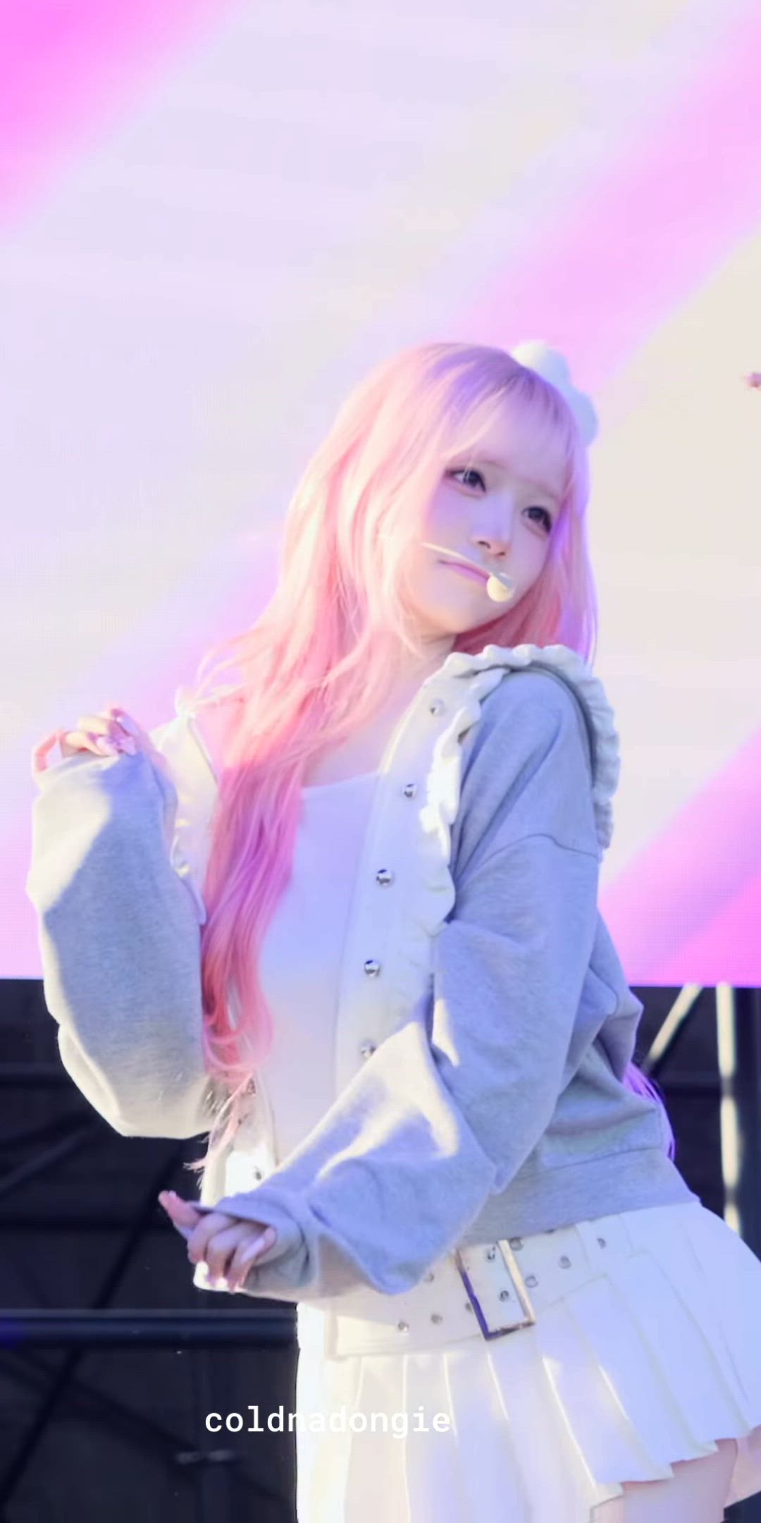 As accessories, Chaewon wears a white fluffy hair clip that complements her pink hair, enhancing her cuteness. She is wearing an in-ear microphone for the stage, and her nails are painted with pink polish, harmonizing with the overall look. Brands like Chanel or Dior offer luxurious hair accessories with similar aesthetics.