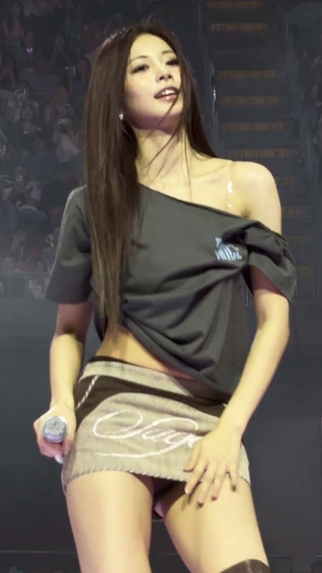 TWICE Tzuyu presents a trendy street fashion as a stage outfit. She pairs a dark-colored off-shoulder crop top with a beige mini skirt, emphasizing a dynamic and fashionable appeal. The bold top, exposing one shoulder, and the short bottom highlight Tzuyu's stylish presence.