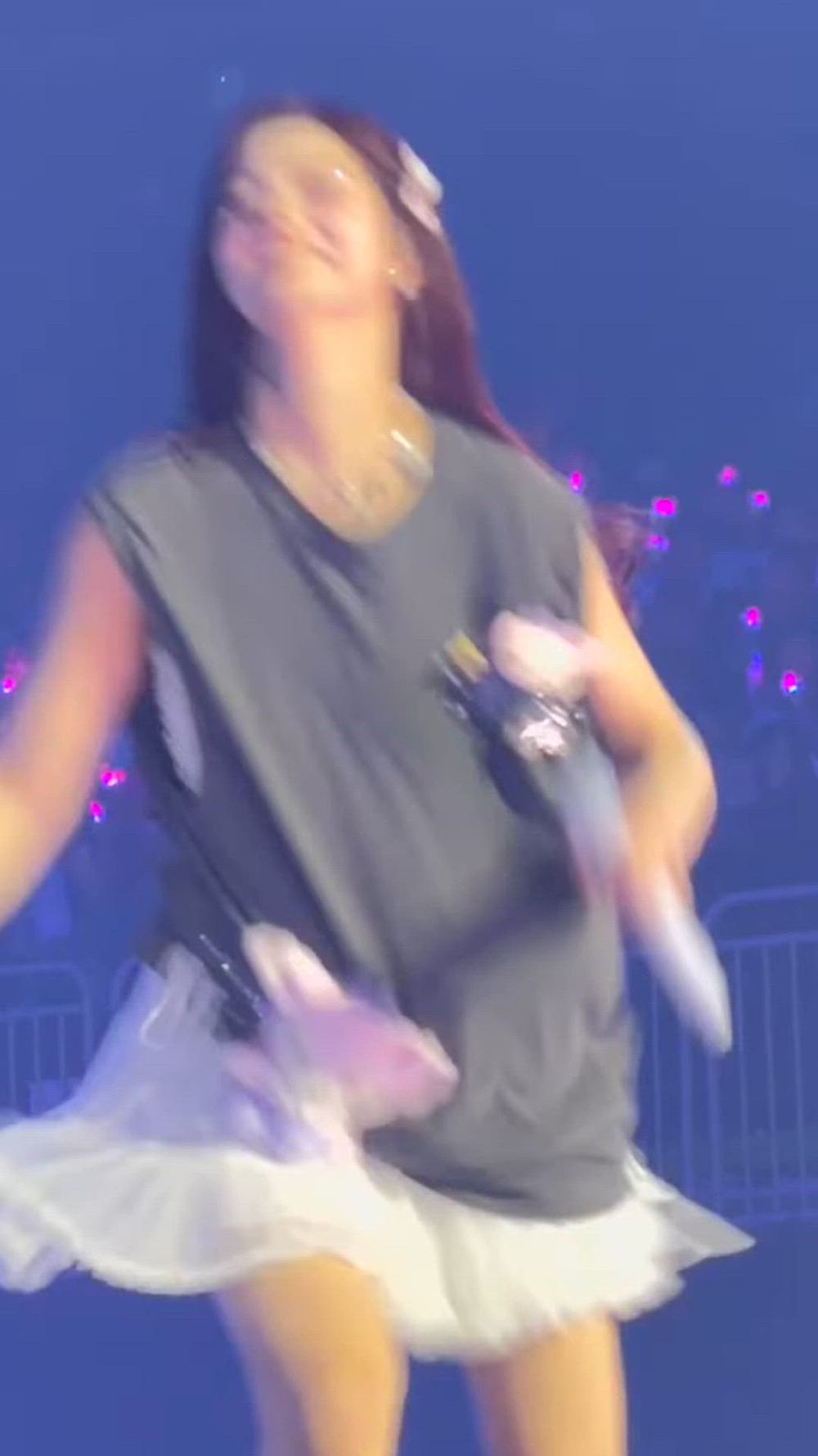 Sullyoon presents a comfortable yet lovely style on a vibrant stage. She emphasizes the playful charm of idol fashion by pairing a loose-fitting dark sleeveless top with a contrasting bright, short ruffled skirt. This combination is suitable for active performances, creating a youthful and free atmosphere with a trendy Y2K style stage outfit.