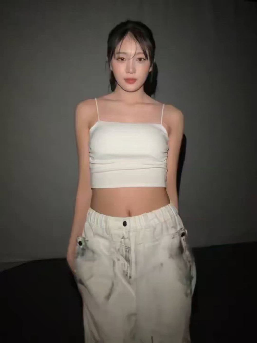 Jiun of BEWAVE presents a chic casual style. She pairs a white crop top with washed cargo pants, creating a comfortable yet trendy fashion look. The overall light-toned outfit and naturally tied hair contribute to a free-spirited and sophisticated vibe. Her minimalist item selection highlights Jiun's healthy charm and modern aesthetic.