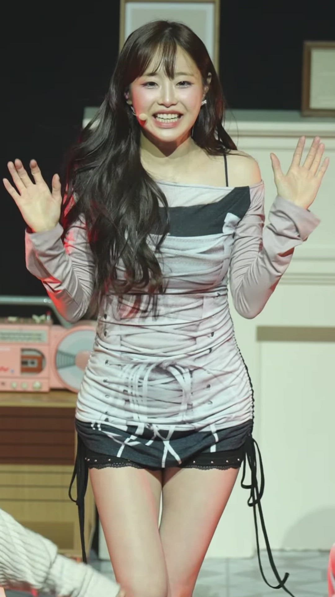 Chuu는 오프숄더 디자인의 핑크 톤 미니 셔링 드레스를 착용하여 발랄하면서도 세련된 무대 의상 스타일을 선보이고 있습니다. 전체적으로 몸에 밀착되는 슬림핏으로 아름다운 실루엣을 강조하며, 드레스 하단에 레이스 디테일이 있는 블랙 쇼츠를 레이어드하여 캐주얼하면서도 여성스러운 매력을 더했습니다. Chuu의 밝은 미소와 어우러져 사랑스러운 분위기를 연출합니다.