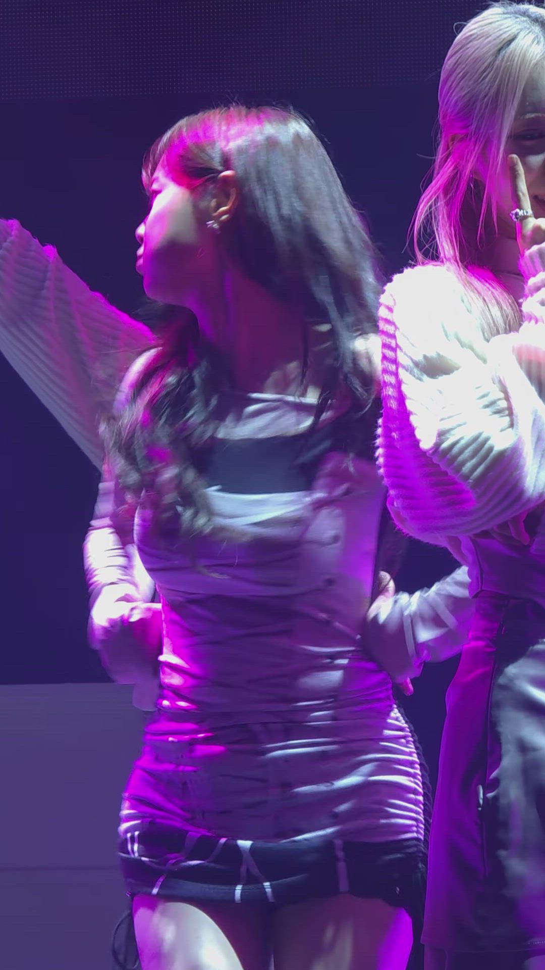 츄는 무대 위에서 퍼포먼스 의상으로 보이는 감각적인 스타일을 선보이고 있습니다. 몸에 밀착되는 루싱 디테일의 상의와 짧은 하의를 매치하여 활동적이면서도 글래머러스한 분위기를 연출합니다. 전체적으로 힙하고 트렌디한 매력이 돋보이는 착장으로, 무대 위에서 시선을 사로잡는 스타일입니다.