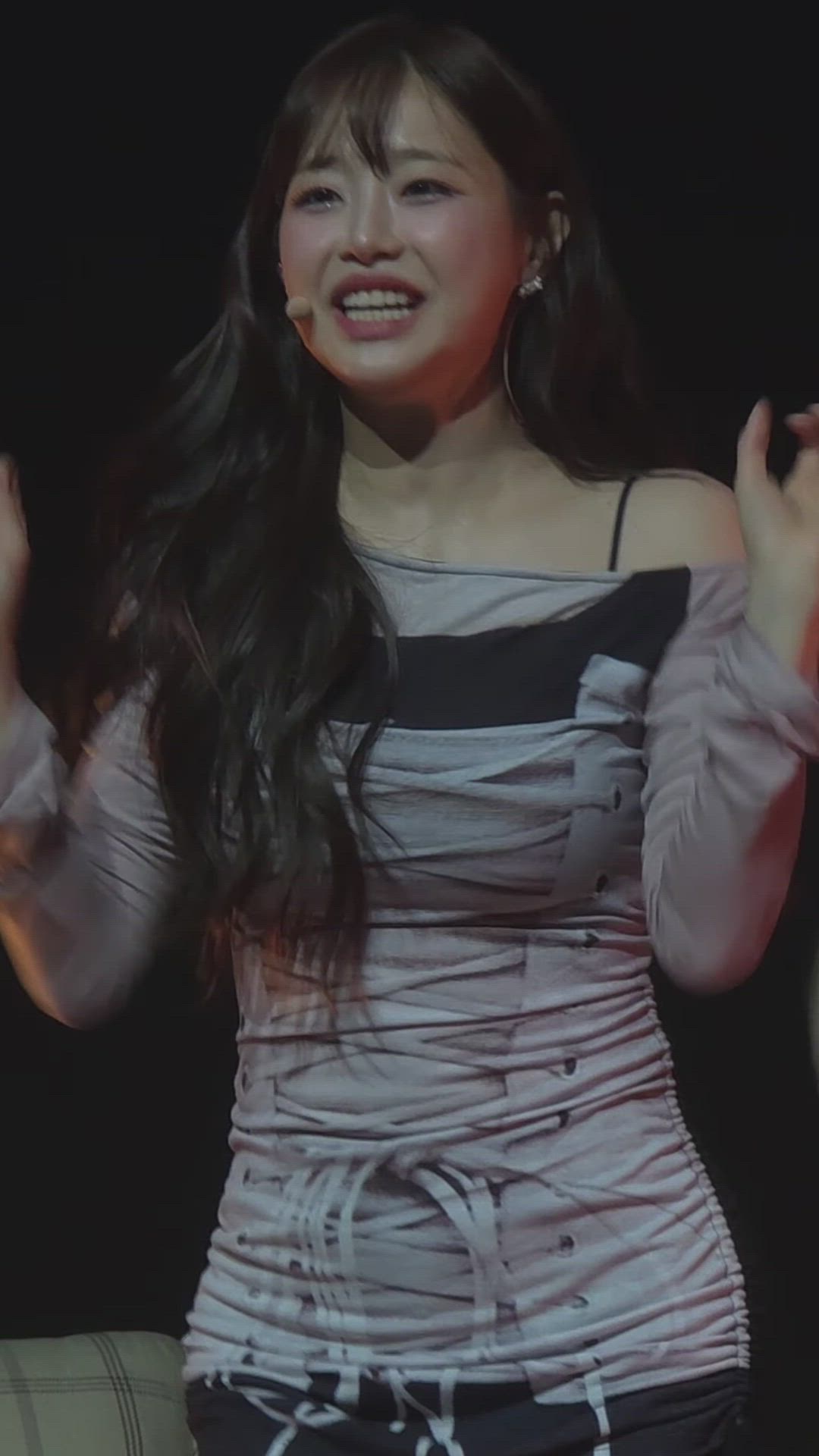 Chuu is wearing a distinctive stage outfit that exudes the charm of designer apparel. The off-shoulder top features a harmonious blend of light gray and black, with body-hugging ruched details that emphasize a trendy fashion sensibility. The bottom, appearing as a graphic pattern mini dress connected to the top, presents a sophisticated and bold overall impression.