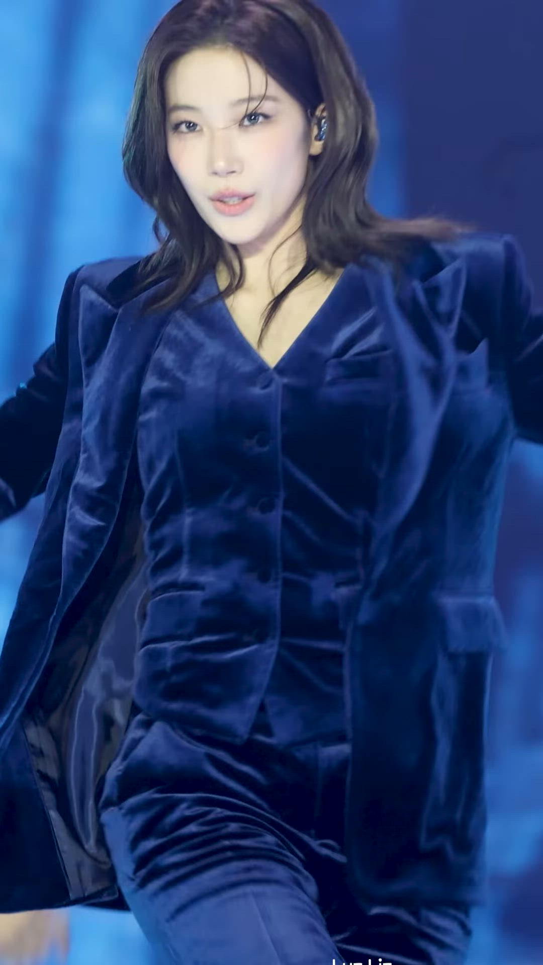 르세라핌 카즈하는 깊은 네이비 컬러의 벨벳 수트를 착용하여 무대 위에서 강렬하면서도 우아한 매력을 발산합니다. 전체적으로 고급스러운 벨벳 소재가 주는 부드러운 광택감은 조명 아래에서 더욱 빛나며, 세련된 실루엣과 어우러져 카즈하의 품격 있는 스타일을 완성합니다. 이 옷차림은 특별한 행사나 공연에 적합한 룩으로, 절제된 화려함이 돋보이는 연출입니다.