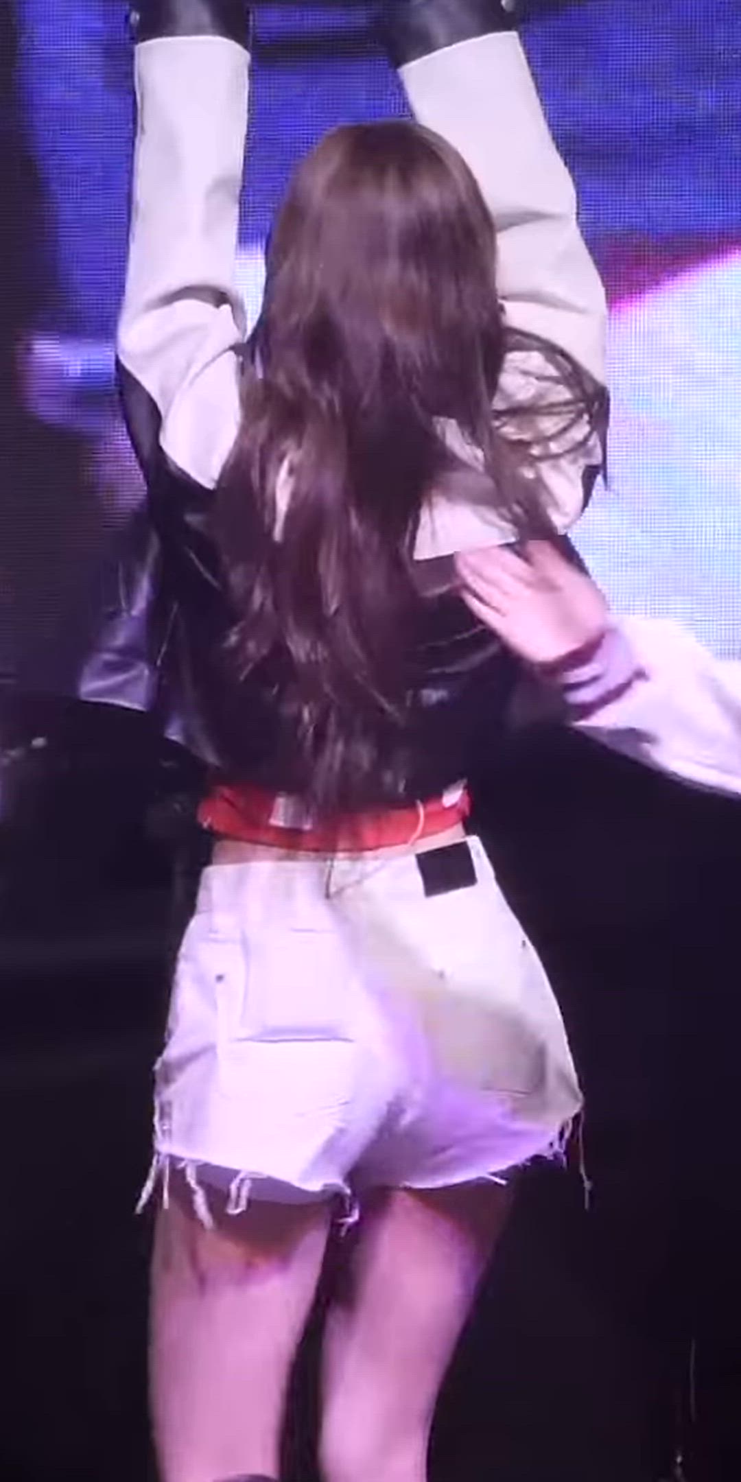 Stella from Hearts2Hearts presents a sporty chic stage outfit. She wears a black and white color-block cropped jacket paired with white denim shorts, creating an active yet trendy look. The overall styling exudes a hip and youthful vibe.