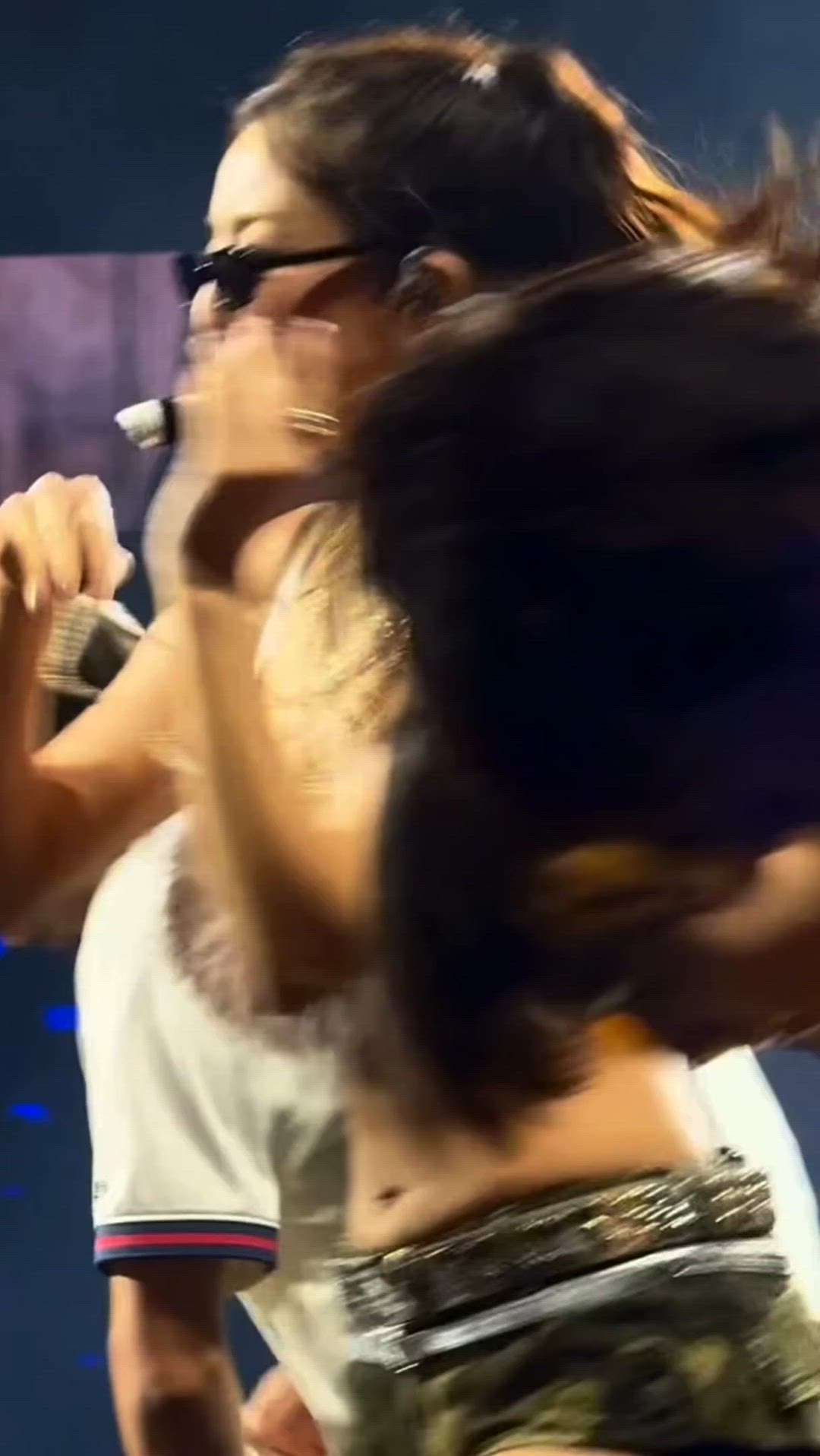 TWICE 지효는 무대 의상으로 보이는 과감하고 에너지 넘치는 스타일을 선보이고 있습니다. 반짝이는 크롭 상의와 카무플라주 패턴의 숏츠를 매치하여 활동적이면서도 화려한 아이돌 패션을 연출했습니다. 전체적으로 힙하고 트렌디한 스타일을 보여주며, 콘서트나 공연에 적합한 역동적인 분위기를 자아냅니다.