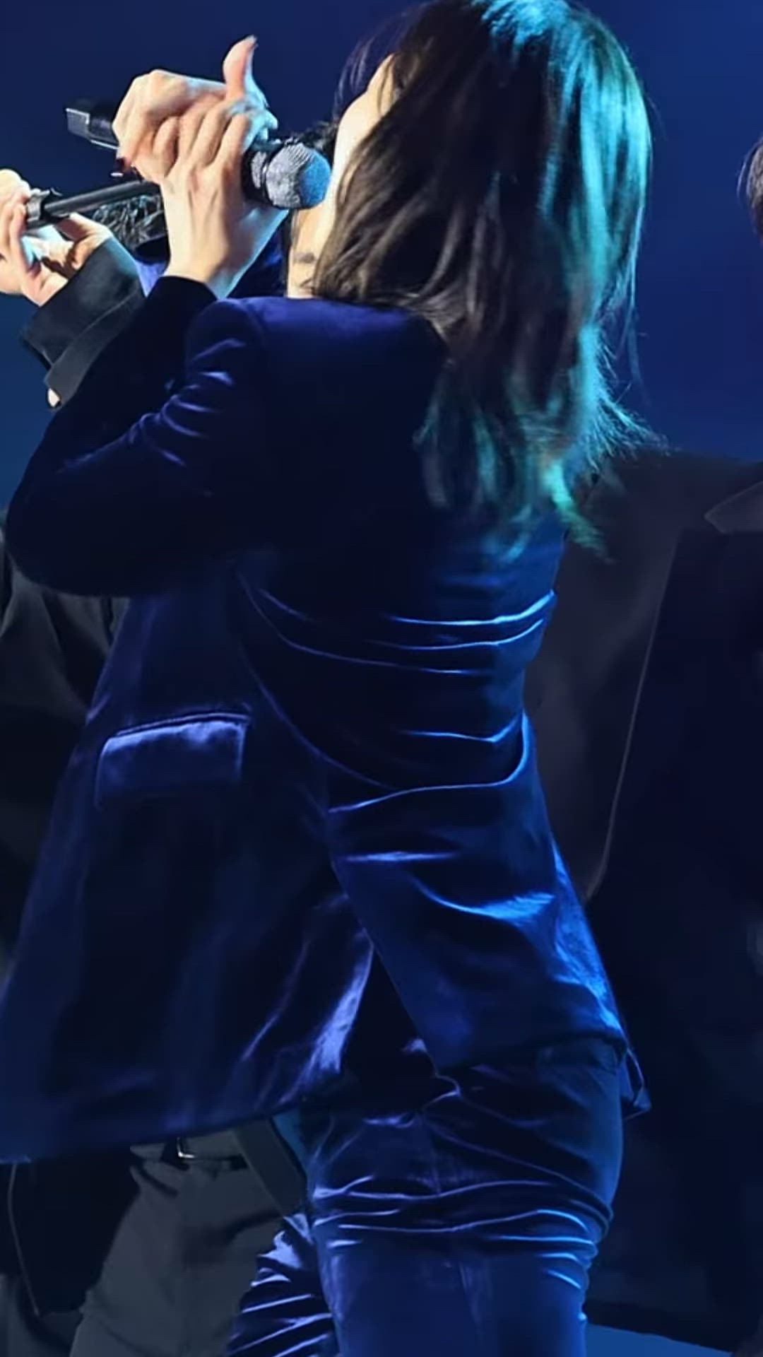 사진 속 카즈하는 깊은 네이비 컬러의 벨벳 수트를 착용하여 우아하면서도 카리스마 있는 무대 의상을 선보입니다. 전체적인 스타일은 럭셔리하면서도 시크한 분위기를 연출하며, 고급스러운 벨벳 소재가 조명 아래에서 아름다운 광택을 발산합니다. 이 테일러드 재킷과 팬츠 셋업은 카즈하의 세련된 이미지를 강조하며, 특별한 자리나 공연에 어울리는 럭셔리 패션 스타일입니다.
