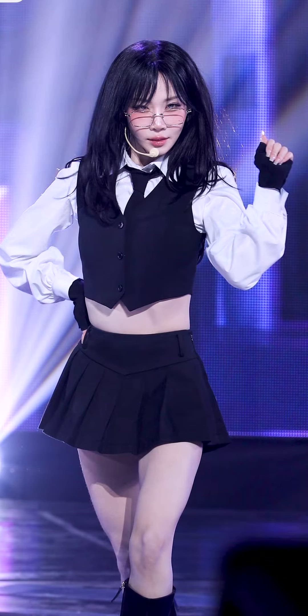 Nakyoung showcases a trendy style and classic charm through her stage outfit. She presents a neat yet lively school look, combining a white cropped shirt, a black cropped vest, and a pleated mini skirt. Pink-tinted glasses and fingerless gloves add a touch of individuality, creating an overall sophisticated and stylish ambiance.