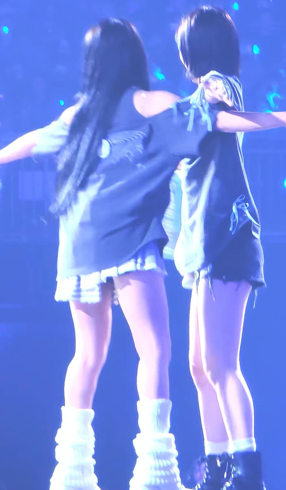 NMIXX 지우는 어두운 색상의 오버사이즈 오프숄더 상의와 밝은 미니 스커트를 매치하여 힙한 스트릿 스타일을 연출하고 있습니다. 특히, 청키한 화이트 레그 워머를 착용하여 독특한 디자인의 무대 의상으로서의 매력을 더했습니다. 전반적으로 편안하면서도 자유분방한 분위기를 자아내며, 활동적인 퍼포먼스에 적합한 개성 있는 룩입니다.
