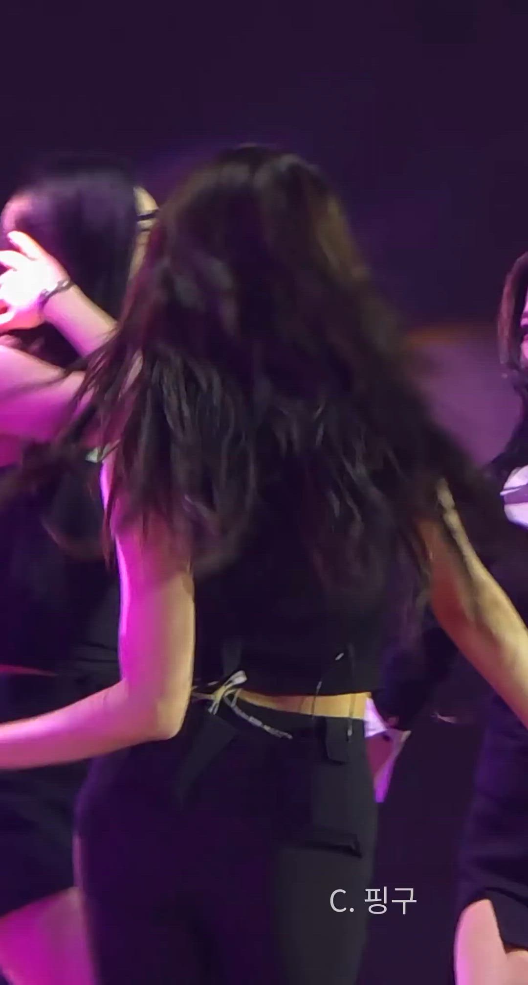 Nagyung is wearing a black sleeveless crop top. It features a precise, slim-fit silhouette that highlights her waistline and appears to be made of a functional fabric that allows for comfortable, dynamic movements on stage. There might be tie details at the back or side, adding a stylish touch. You can find similar slim-fit tops from brands like AllSaints or Aritzia.