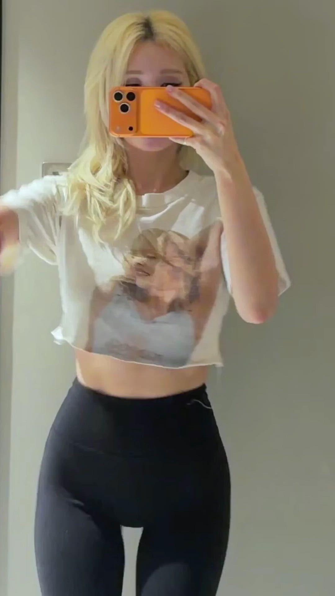 Jeon Somi presents a casual yet active athleisure style. She pairs a vintage-inspired graphic crop top t-shirt with form-fitting black leggings, creating a comfortable yet trendy vibe. The overall look, combined with her bright hair color, emphasizes a lively and youthful aesthetic.