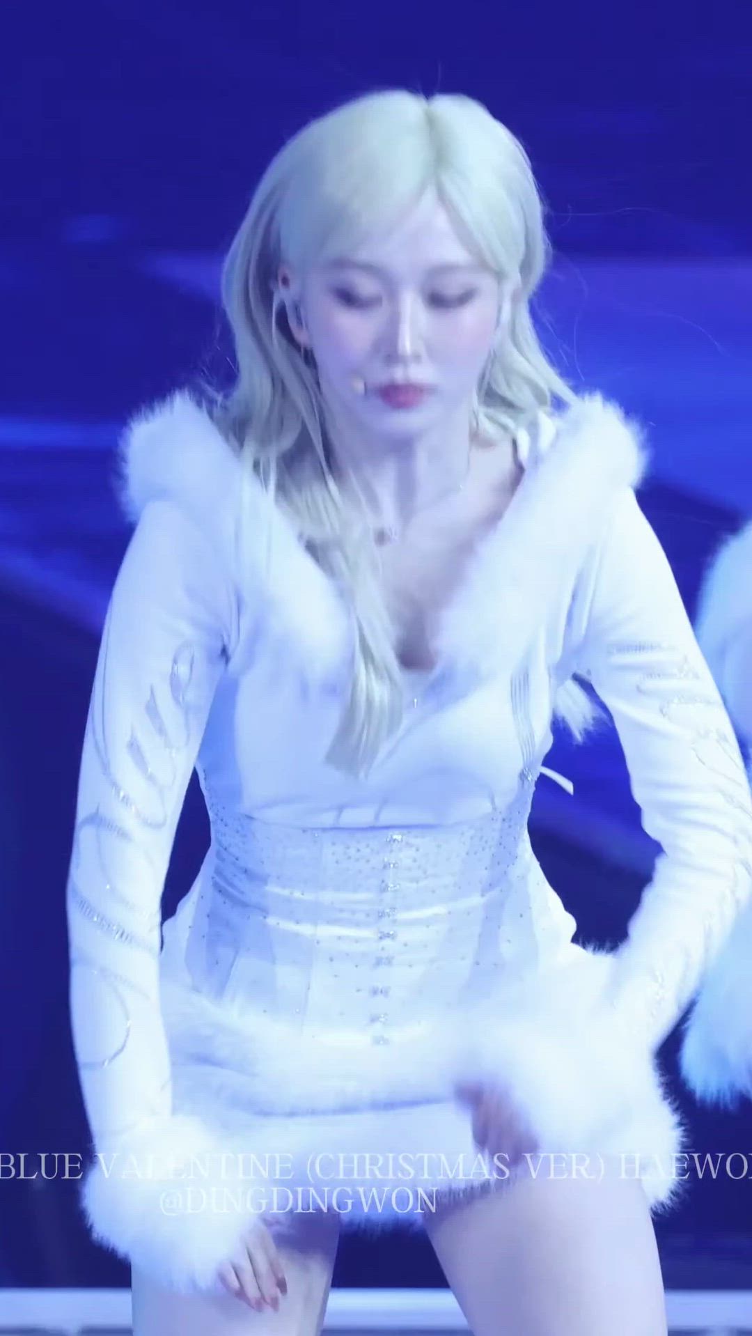 The outfit appears to be a mini dress, integrated with the top. The bottom part is also white, with the same soft fur trim adorning the hem, creating a cohesive look. Its short length enhances mobility while highlighting her legs. The overall body-hugging fit provides comfort during dance performances. This style is comparable to glamorous mini dresses released by brands such as House of CB or Guess.