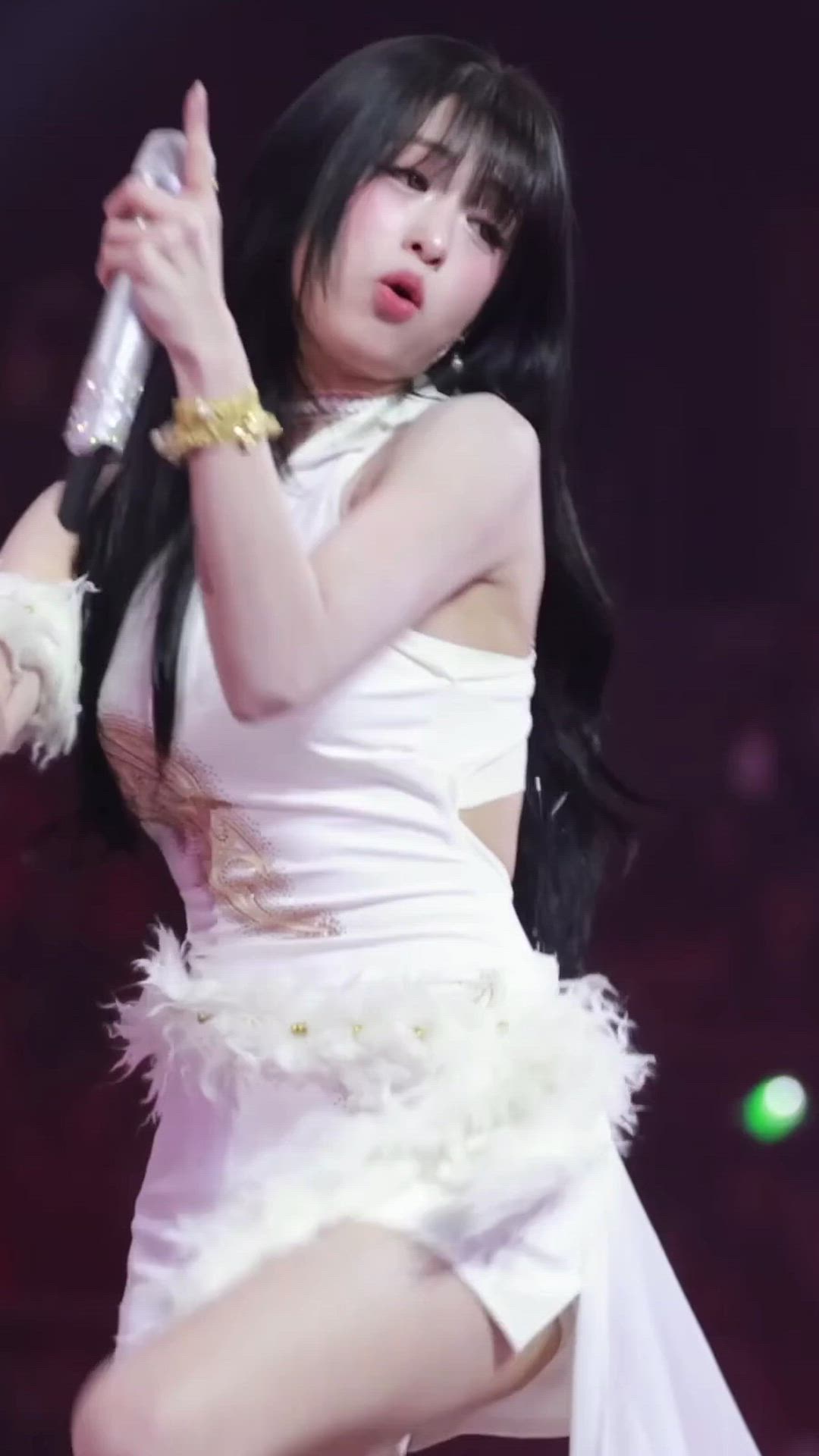 아현은 화려한 스테이지 의상을 입고 있습니다. 전반적으로 화이트 컬러의 드레스는 바디라인을 강조하며, 상의에는 골드 자수 디테일이, 하의 허리 부분에는 풍성한 페더 장식이 더해져 글래머러스하고 우아한 분위기를 연출합니다.