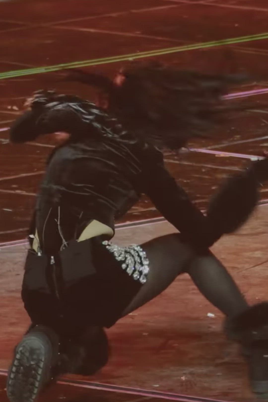 블랙 미니 스커트 또는 숏 팬츠입니다. 왼쪽 허벅지 부분에 실버 글리터 또는 크리스탈 장식이 포인트로 더해져 글램 코어 느낌을 극대화합니다. 숏한 기장으로 활동성을 높였으며, 상의와 통일감 있는 블랙 컬러로 전체적인 룩의 조화를 이룹니다. 화려한 장식이 특징인 의상은 Givenchy나 Philipp Plein에서 유사한 디자인을 선보입니다.