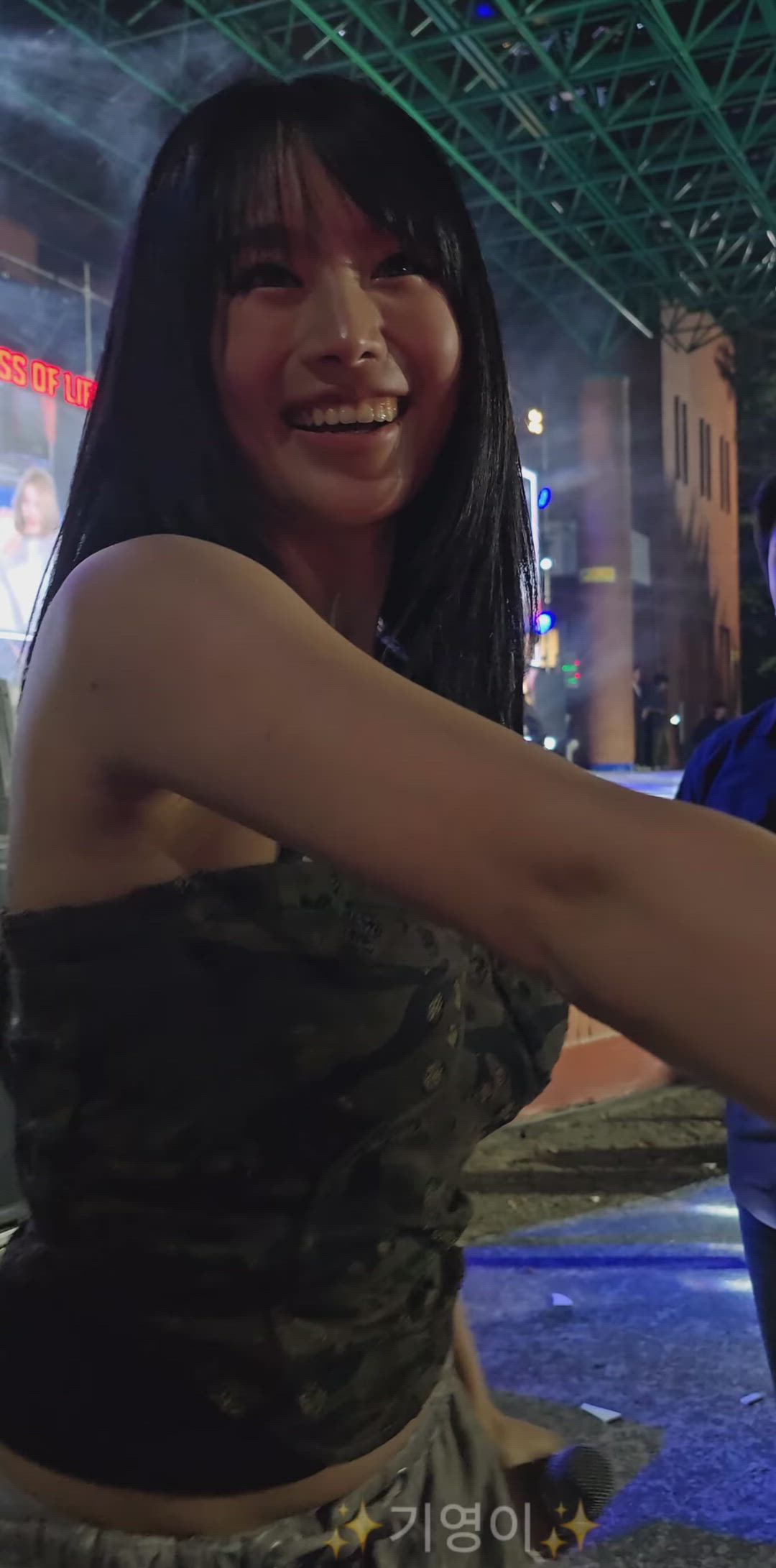 KISS OF LIFE 나띠는 트렌디한 스타일을 완벽하게 소화하고 있습니다. 어두운 계열의 튜브톱 상의와 하의를 매치하여 편안하면서도 감각적인 룩을 연출했습니다. 나띠는 자연스러운 헤어스타일과 미소로 발랄하고 생기 넘치는 매력을 더하고 있습니다. 전체적으로 간결하면서도 고급스러운 디테일이 돋보이는 착장이며, 마치 컬렉션 아이템을 연상하게 합니다.