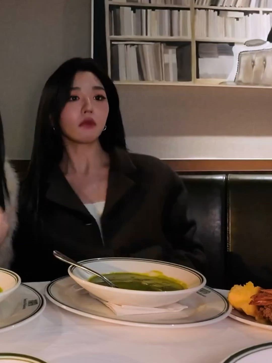 소현은 짙은 차콜 그레이 또는 블랙 컬러의 클래식 블레이저를 착용하고 있습니다. 이 재킷은 와이드한 라펠과 여유 있는 핏을 가지고 있으며, 어깨 라인이 자연스럽게 떨어지는 디자인입니다. 매끄러운 질감의 소재로 제작되어 고급스러운 느낌을 주며, 안에는 밝은 아이보리 또는 화이트 컬러의 새틴 또는 실크 소재로 보이는 슬리브리스 톱을 매치하여 부드러운 대비를 이룹니다. 이러한 조합은 Celine이나 Max Mara의 테일러링에서 볼 수 있는 정교한 스타일을 연상시킵니다.