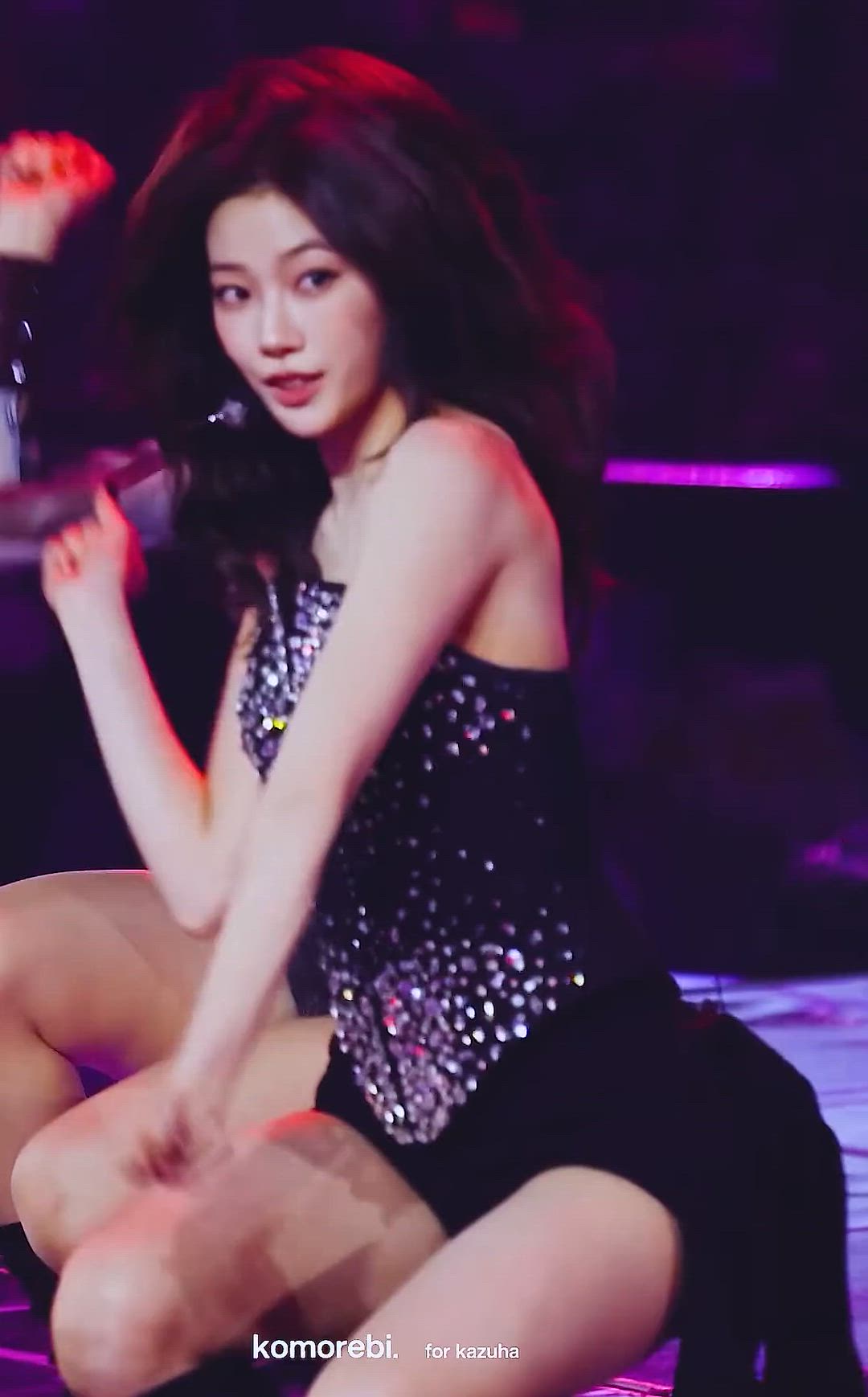 사진 속 르세라핌 카즈하는 강렬한 무대 위에서 빛나는 글램룩을 선보이고 있습니다. 전체적으로 블랙 컬러를 기반으로 하여 시크하면서도, 상의에 화려하게 수놓아진 시퀸 의상 디테일이 시선을 사로잡습니다. 역동적인 퍼포먼스에 최적화된 의상으로, 활동성과 스타일을 동시에 만족시키는 무대 의상입니다. 카즈하의 우아하면서도 파워풀한 이미지를 강조하는 스타일링입니다.