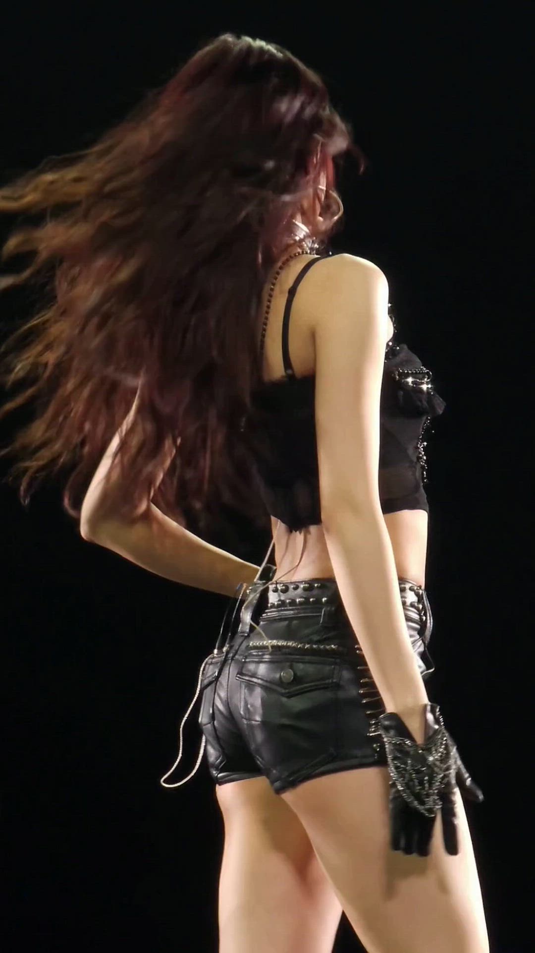 TWICE 쯔위는 강렬하고 락시크 무드의 무대 의상을 선보이고 있습니다. 전체적으로 블랙 컬러의 아이템들을 활용하여 시크하면서도 과감한 스타일을 연출합니다. 특히 스터드 장식과 가죽 소재가 돋보이는 의상과 액세서리들이 조화를 이루어 독특한 매력을 발산합니다.