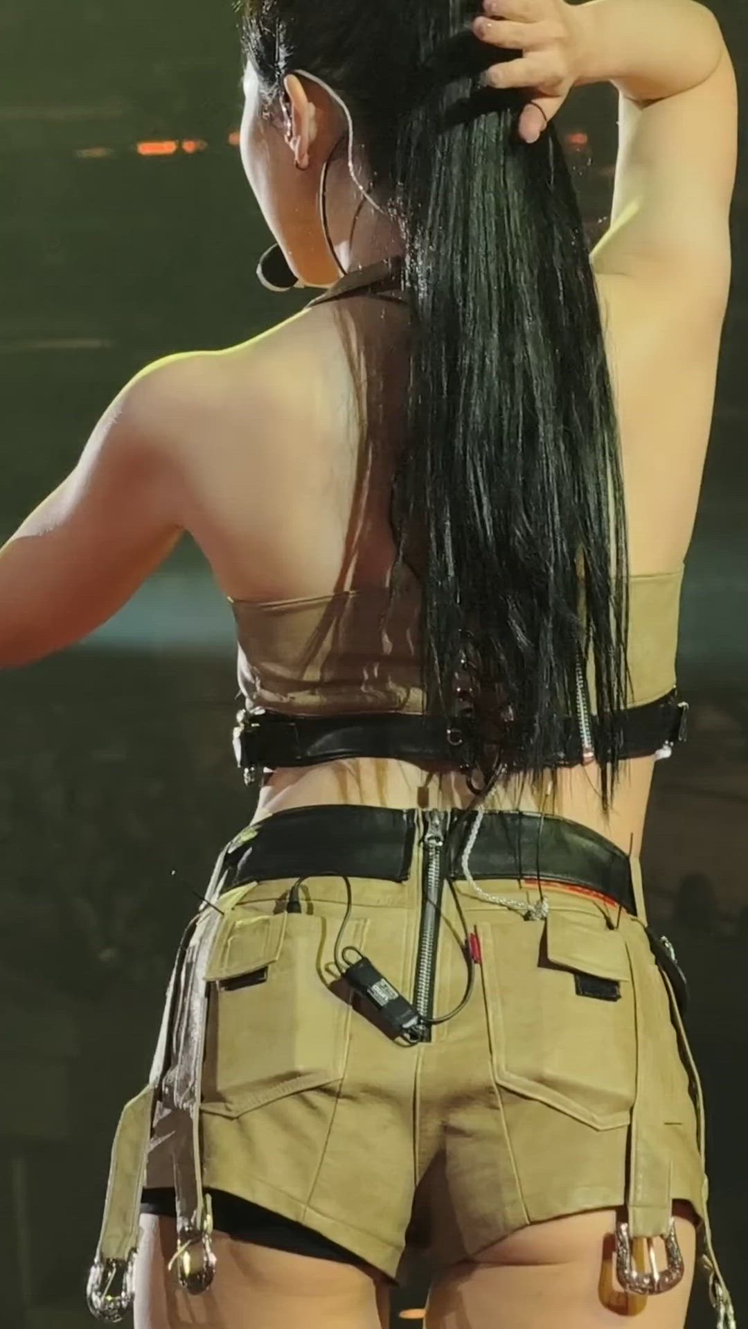 TWICE Mina presents a bold and high-fashion stage outfit that reflects global fashion trends. She pairs a beige-toned crop top with utility shorts, creating a powerful yet sophisticated ambiance. The overall tight fit, emphasizing her physique, combined with leather and metallic details, completes a captivating style that draws attention.