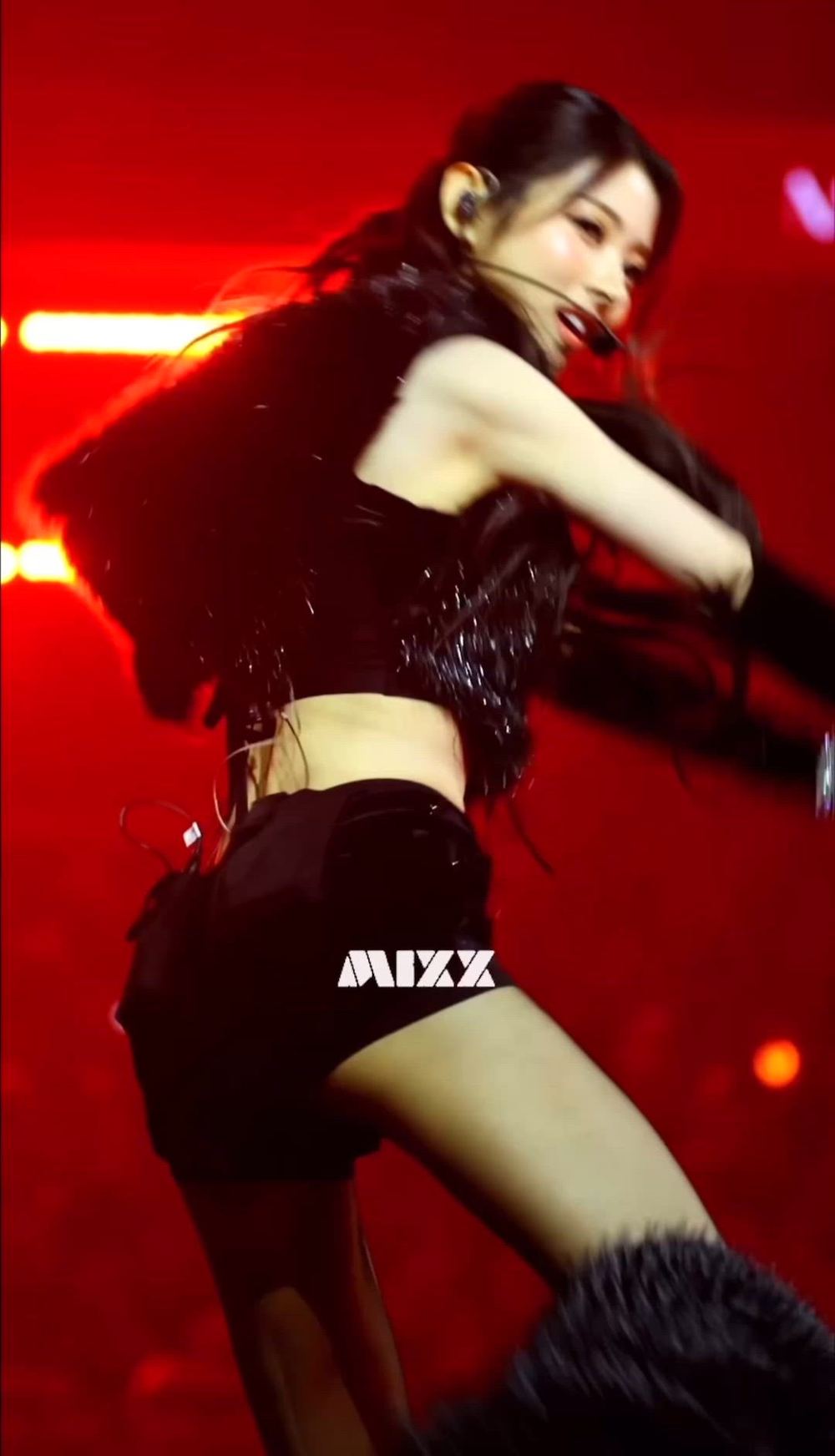 Anna from MEOVV showcases a chic and glamorous style in this stage outfit. The all-black ensemble is enhanced with rich textures and intricate details, creating a powerful yet sophisticated aura. The voluminous feathered embellishments on her top add a visually striking element that complements her dynamic performance. The cropped design and velvet shorts highlight Anna's energetic and healthy charm. Overall, it is a dramatic stage costume that perfectly embodies the charismatic presence of an idol.