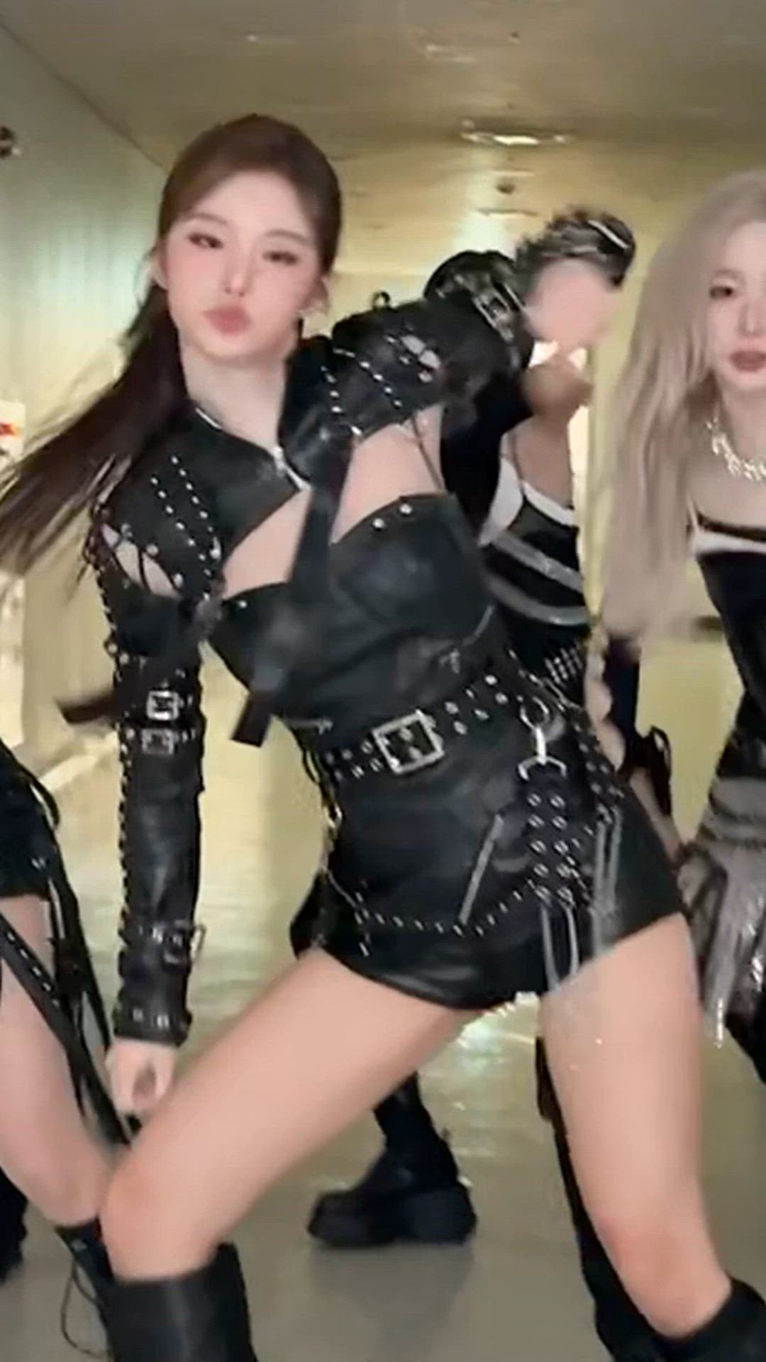 Sullyoon is wearing a striking stage outfit that exudes a strong rock chic vibe. She showcases a chic and bold appeal by utilizing all-black leather fashion items. The punk style ensemble, consisting of a heavily studded and buckled crop top and matching shorts, emphasizes Sullyoon's charismatic presence.