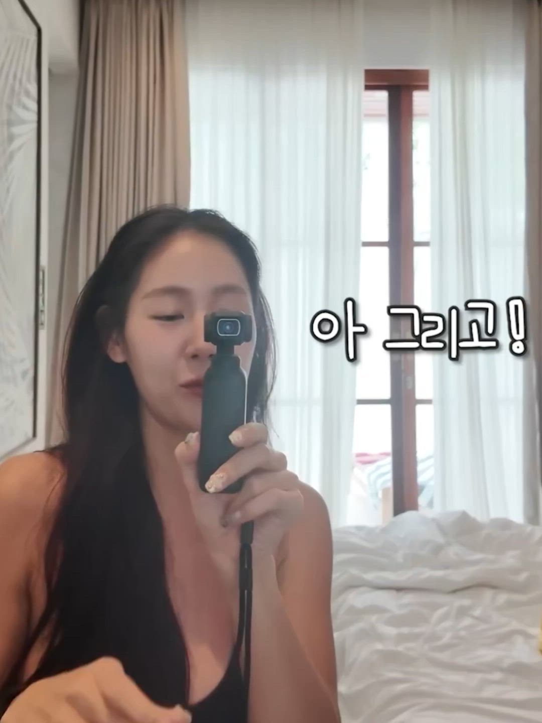 별다른 액세서리는 착용하지 않았습니다. 다만, 손톱에는 연한 베이지색 또는 누드톤의 네일 아트가 되어 있어 깔끔하면서도 세련된 인상을 줍니다. 손에 들고 있는 것은 DJI 오즈모 포켓과 같은 휴대용 카메라 장비로 보입니다.