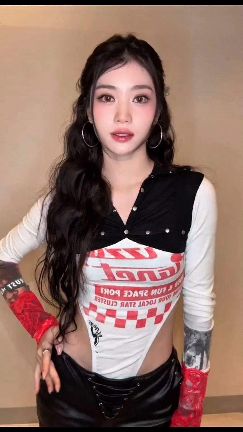 Kep1er의 션샤오팅은 강렬한 스트리트웨어 감각과 Y2K 스타일이 돋보이는 개성 있는 룩을 선보입니다. 몸에 밀착되는 그래픽 바디수트와 로우 라이즈 가죽 미니스커트를 매치하여 과감하면서도 트렌디한 매력을 강조합니다. 전체적으로 힙하고 에너제틱한 분위기를 연출하며, 액세서리 또한 스타일의 완성도를 높여줍니다.