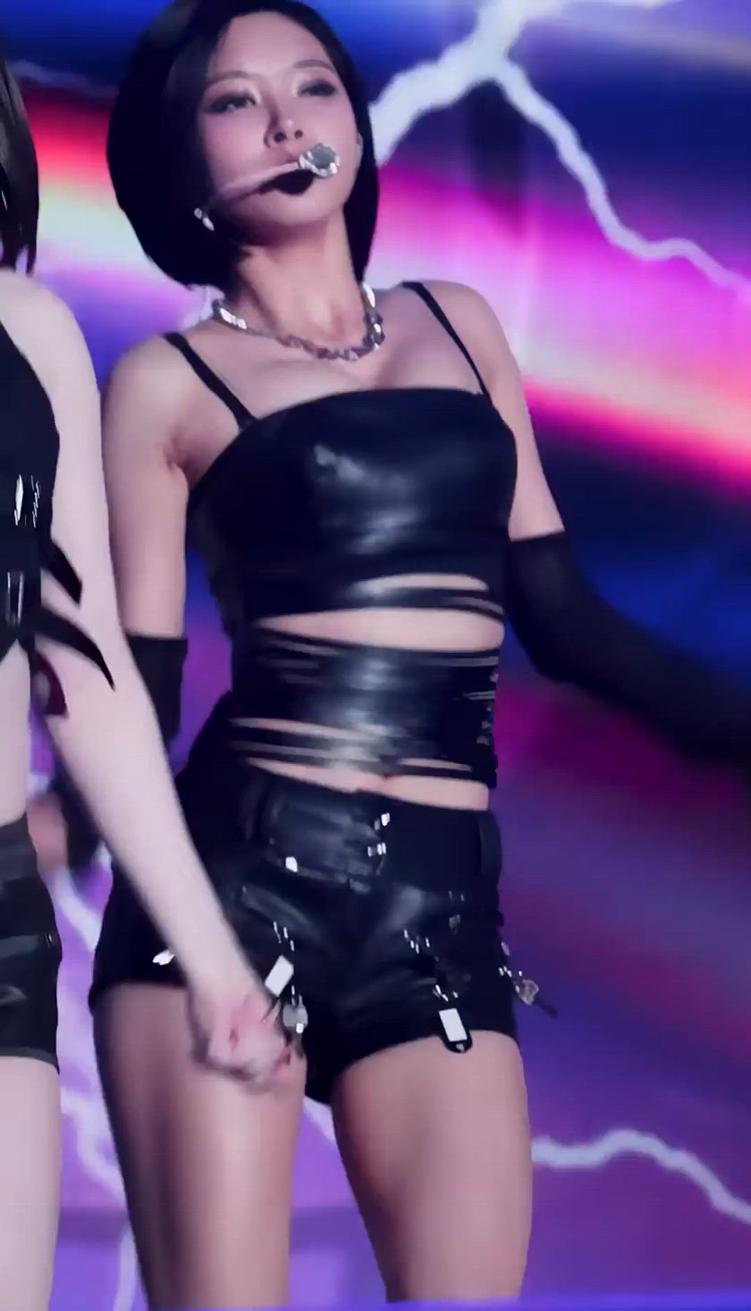 - Leather Cut-out Crop Top: A leather crop top with bold cut-out designs around the waist, perfect for creating an intense stage look like Dayeon's, with similar designs available from brands such as Givenchy or Celine.