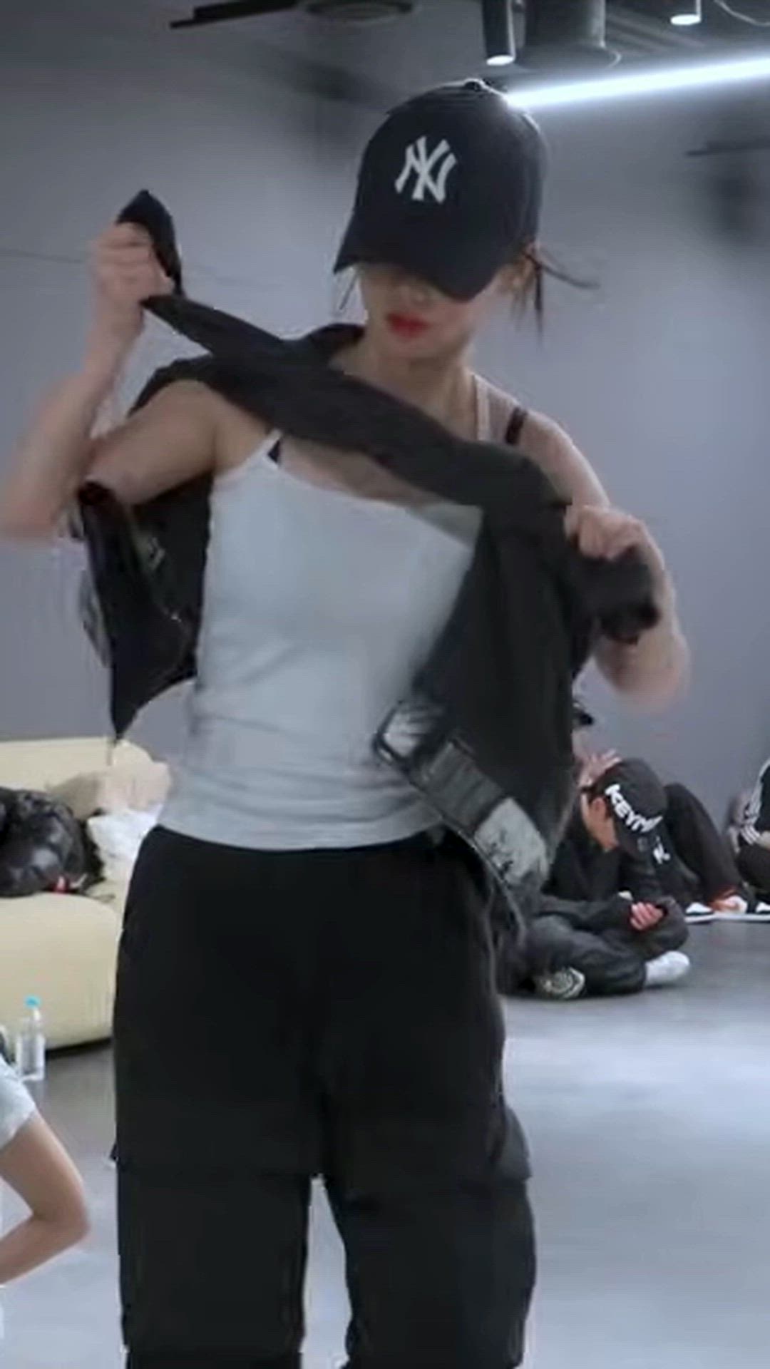 Karina presents a comfortable yet active training look. She pairs a white tank top with black cargo pants and a baseball cap, creating a practical casual style. This outfit incorporates elements of free-spirited street wear, suitable for dance practice or daily activities.