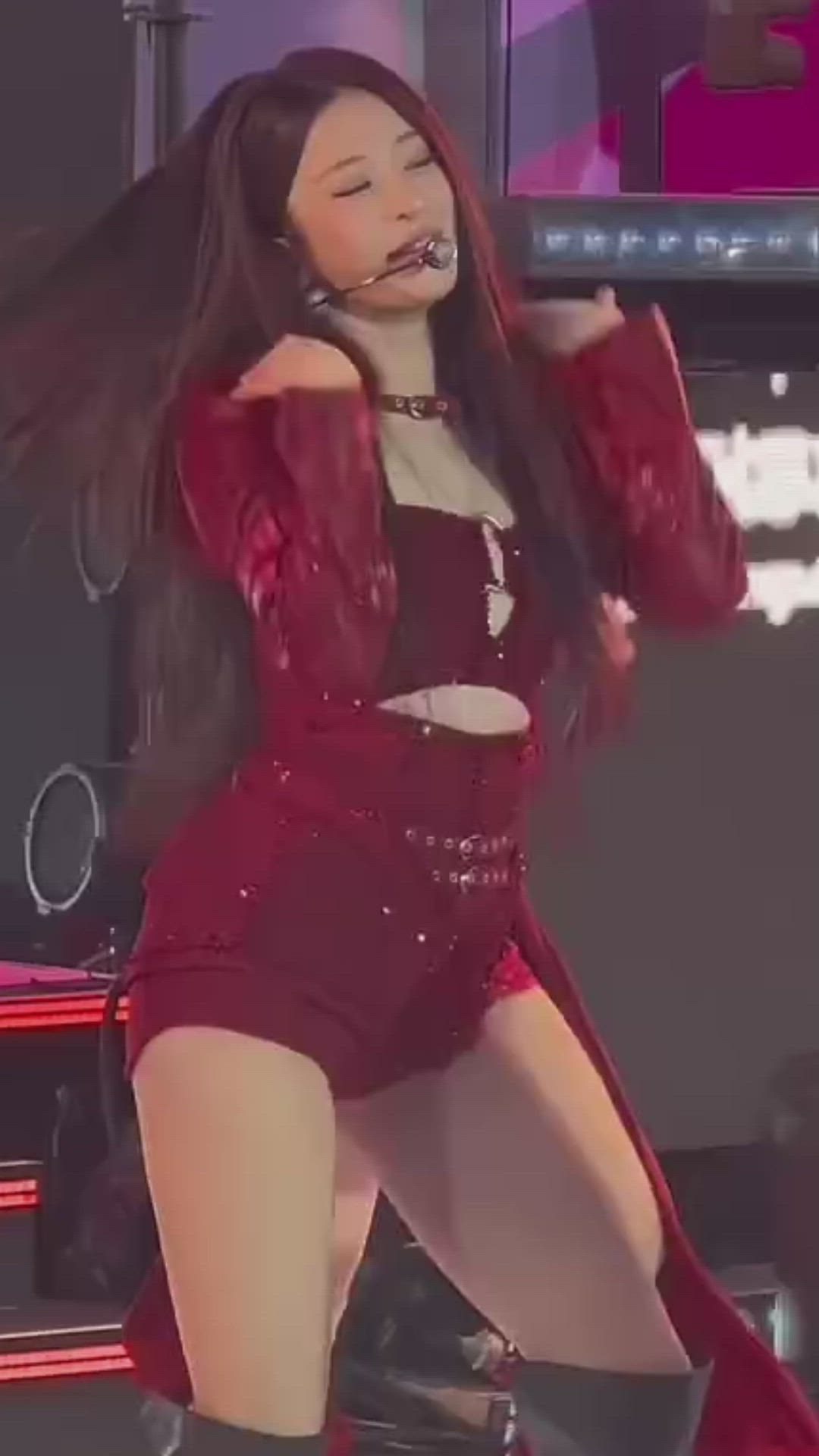 허윤진은 강렬한 버건디 컬러의 무대 의상을 착용하여 아이돌 무대 의상의 화려함을 선보이고 있습니다. 상의는 컷아웃 디테일이 돋보이는 브라톱과 긴 소매의 재킷으로 구성되어 있으며, 전체적으로 반짝이는 글리터 디테일이 더해져 역동적인 퍼포먼스에 어울리는 강렬한 인상을 줍니다. 하의는 매칭되는 숏츠에 드레이프 디테일이 추가되어 세련된 스타일을 완성합니다.