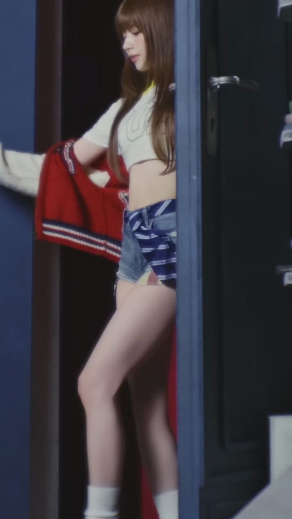 사진 속 사나는 스트리트 캐주얼 스타일을 선보이며 젊고 활동적인 분위기를 연출하고 있습니다. 흰색 크롭 티셔츠와 데님 숏 팬츠를 매치하여 편안하면서도 트렌디한 아이돌 패션을 완성했습니다. 여기에 레드 컬러의 바시티 재킷을 어깨에 걸쳐 영 패션의 발랄함과 스포티한 매력을 더하고 있습니다. 전체적으로 활기차고 자신감 넘치는 모습이 돋보이는 착장입니다.
