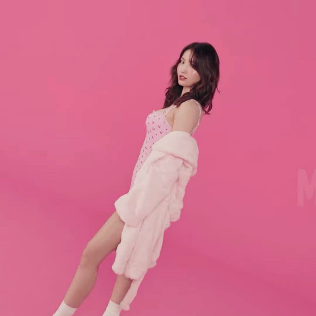 TWICE 모모는 화사한 핑크 배경 앞에서 사랑스러운 페미닌룩을 선보이고 있습니다. 핑크색 체리 프린트 슬립 드레스 위에 부드러운 핑크색 인조 퍼 재킷을 걸쳐 럭셔리 캐주얼의 매력을 더했습니다. 전반적으로 귀엽고 로맨틱한 분위기를 연출하며, 편안하면서도 스타일리시한 모습을 강조합니다.