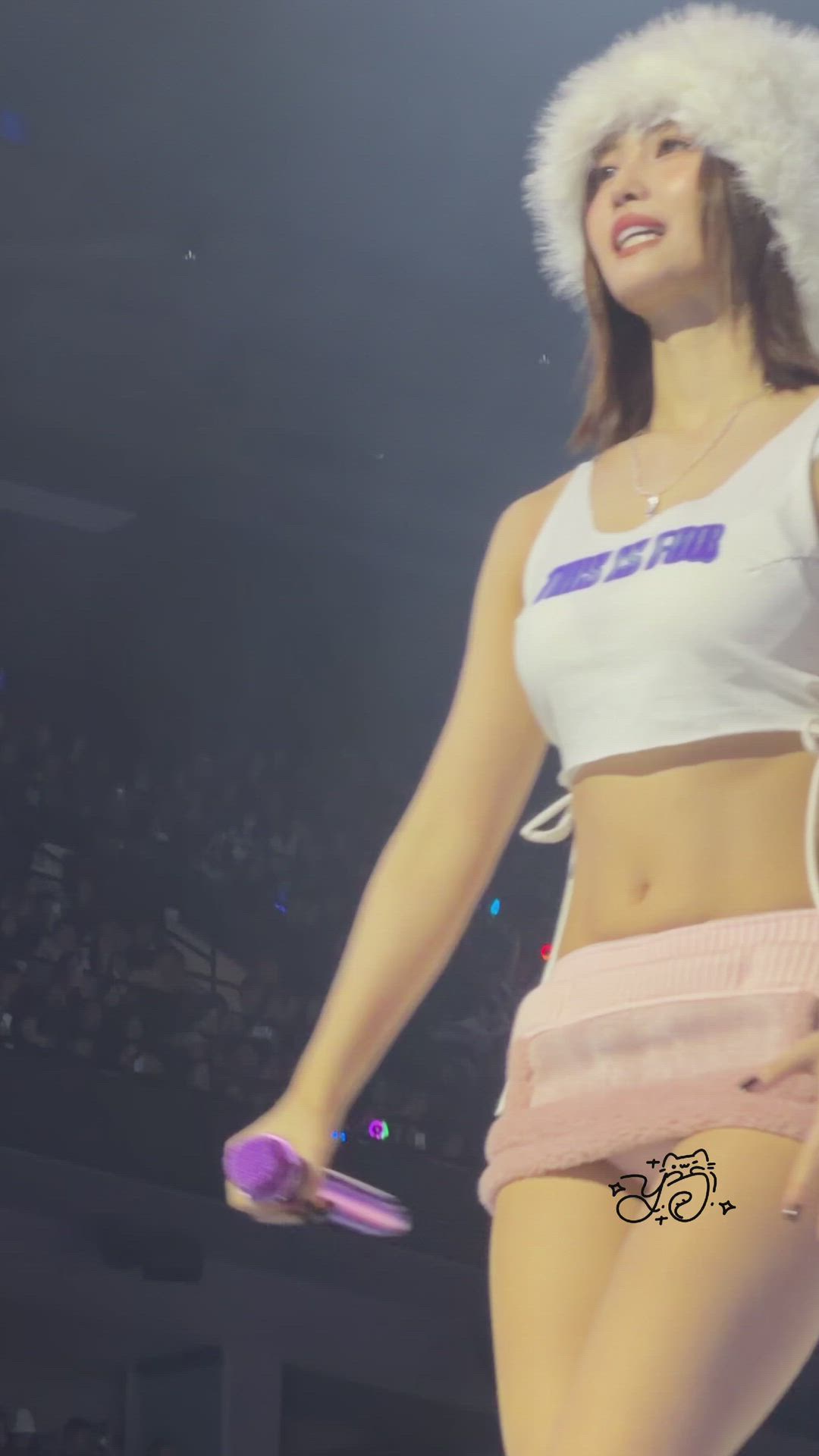 TWICE Momo presents an outfit that fully showcases the charm of kitsch fashion on stage. She pairs a white cropped tank top with a pink mini skirt, creating a lively and active vibe. Notably, she wears a cozy white fur bucket hat, adding a unique yet lovely focal point to the overall look. This idol stage outfit effectively highlights Momo's individuality and leaves a strong impression on fans.