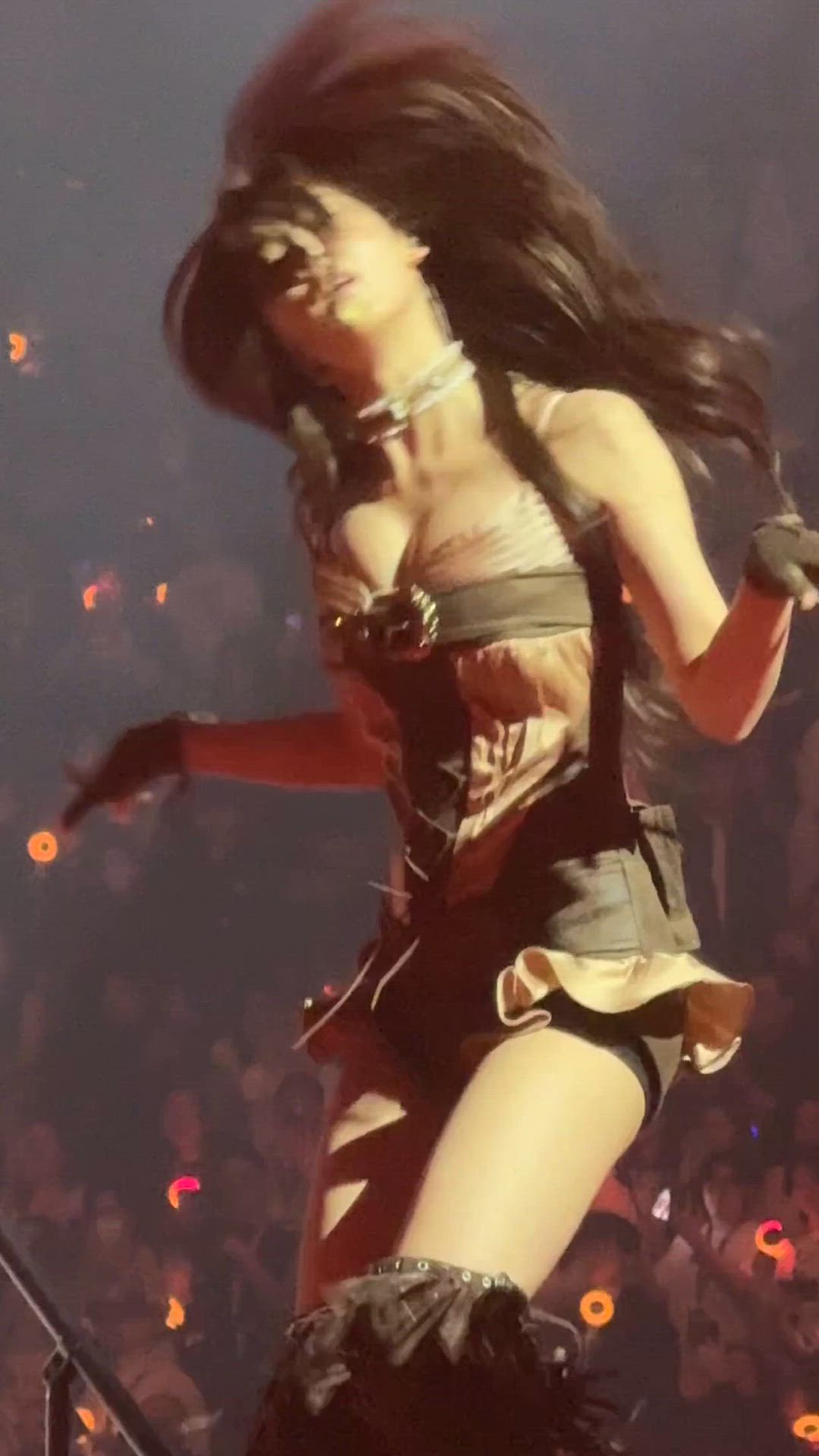 TWICE 사나는 무대 위에서 강렬하면서도 매혹적인 분위기를 연출하는 코르셋 스타일의 의상을 착용하고 있습니다. 전체적으로 블랙과 베이지 톤이 어우러져 시크한 매력을 더하며, 다양한 소재와 디테일이 조화를 이루어 레이어드된 듯한 입체감을 선사합니다. 역동적인 안무에 맞춰 길게 휘날리는 머리카락과 함께 무대 의상으로서의 존재감을 확실히 보여줍니다.