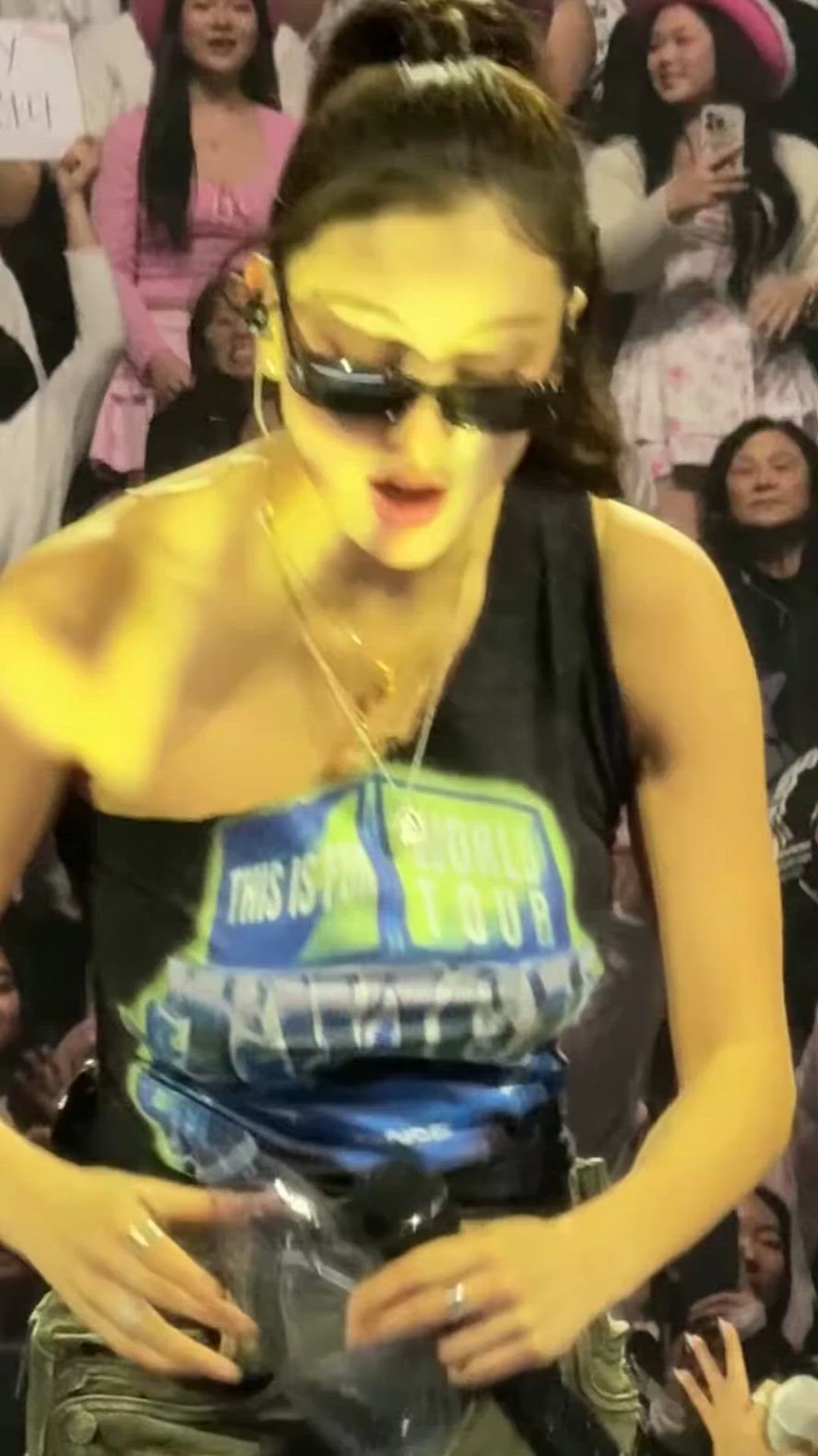 TWICE 지효는 힙한 분위기의 캐주얼한 의상으로 무대 위에서 강렬한 존재감을 드러냅니다. 어깨를 시원하게 드러내는 블랙 컬러의 원숄더 탱크톱과 편안한 핏의 다크 카고 팬츠를 매치하여 활동적이면서도 개성 있는 스트릿 패션을 완성했습니다. 여기에 선글라스와 레이어드 목걸이로 시크한 분위기를 더해, 지효의 당당한 매력을 한층 부각하고 있습니다.