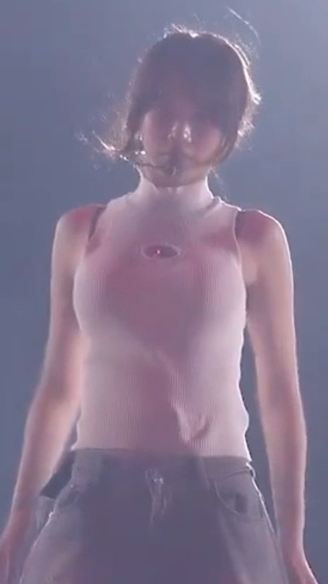 LE SSERAFIM's Chaewon presents a casual yet sophisticated stage outfit with a distinct Y2K style on stage. She pairs a light-colored sleeveless top with dark-toned loose-fit bottoms, creating a chic ambiance. The unique cutout detail on the top particularly draws attention, completing an overall comfortable yet trendy contemporary fashion look.