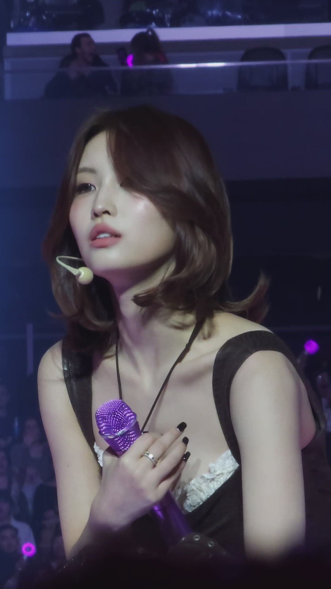 모모는 무대 위에서 고급스러운 매력이 돋보이는 퍼포먼스 룩을 선보이고 있습니다. 어두운 계열의 상의와 섬세한 레이스 디테일이 조화를 이루어 시크하면서도 여성스러운 분위기를 연출합니다. 강렬한 블랙 네일과 심플한 링 액세서리가 모모의 세련된 스타일을 더욱 강조합니다. 이러한 조합은 무대 위에서 카리스마를 발산하며, 보는 이들에게 깊은 인상을 남깁니다.