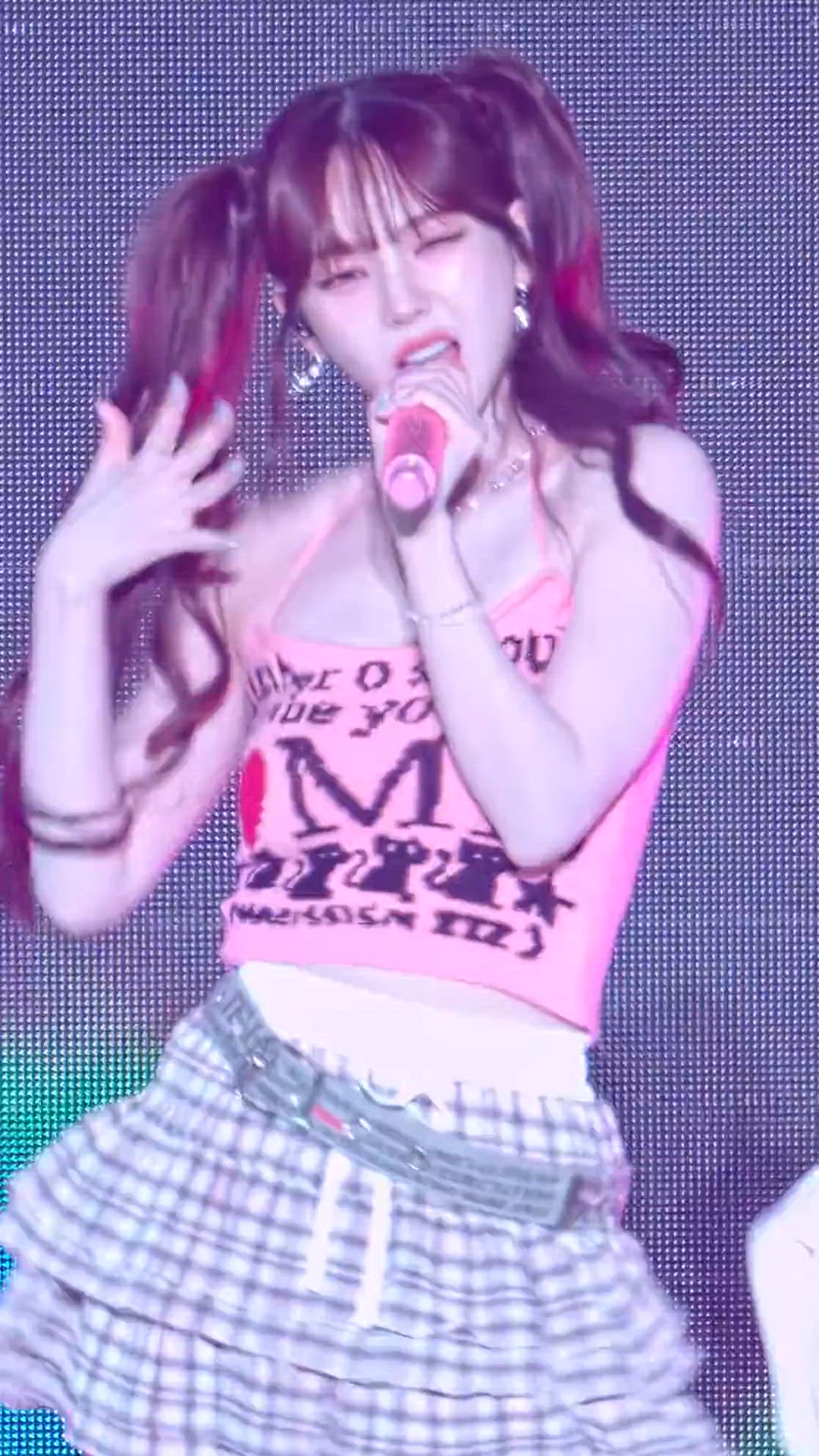 aespa의 Karina는 트렌디한 무대 의상으로 발랄하고 팝한 매력을 선보입니다. 핑크색 홀터넥 크롭탑과 체크 패턴의 티어드 미니 스커트를 매치하여 Y2K 감성을 강조하며, 전체적으로 개성 있는 패션을 연출하고 있습니다. 트윈테일 헤어스타일과 함께 젊고 에너지 넘치는 분위기를 자아냅니다.