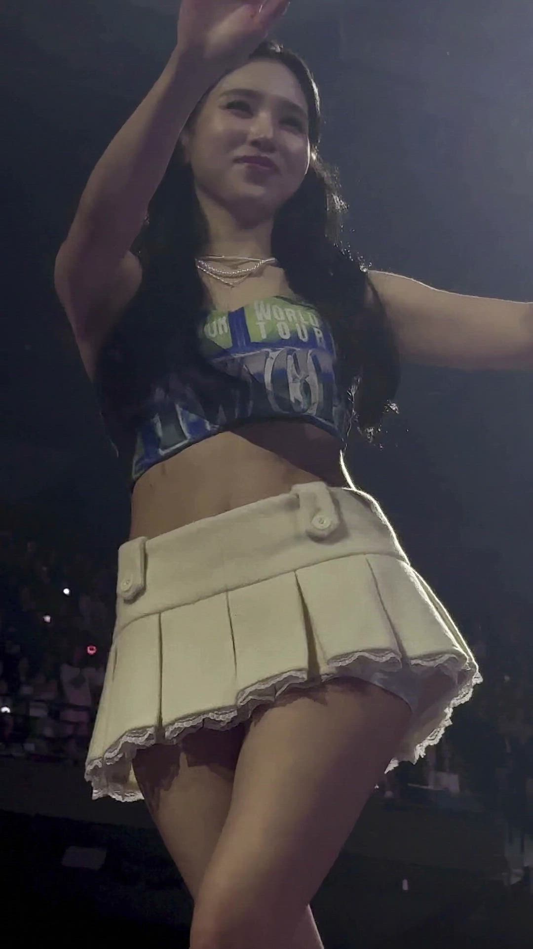 미나는 다양한 컬러가 혼합된 그래픽 프린트의 크롭탑을 착용하고 있습니다. 이 상의는 네크라인이 둥글고 소매가 없는 디자인으로, 복부를 드러내는 짧은 기장이 특징입니다. 'WORLD TOUR'와 같은 문구가 인쇄되어 있어 콘서트나 퍼포먼스 의상으로 보입니다. 신축성 있는 소재로 몸에 밀착되는 핏을 연출하여 활동성을 강조합니다. 이와 유사한 스타일은 Diesel, G-Star RAW와 같은 브랜드에서 찾아볼 수 있습니다.