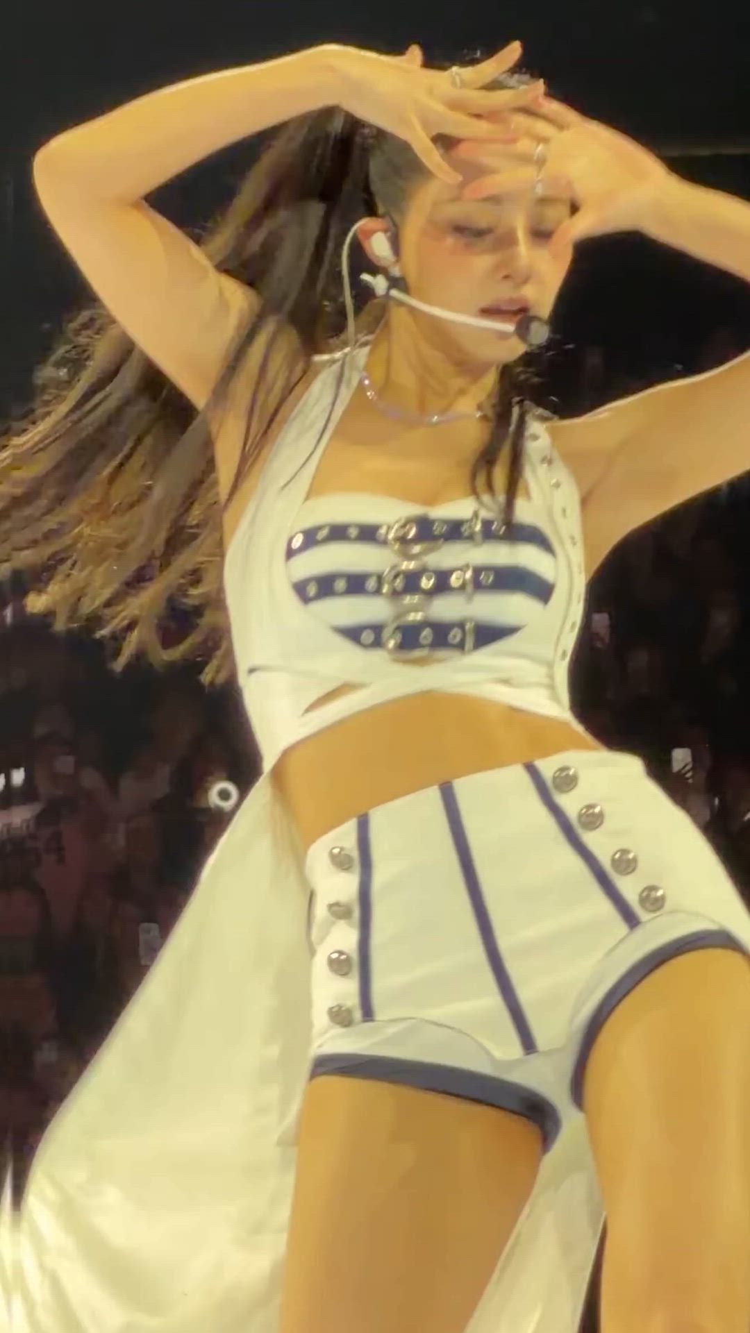 TWICE's Tzuyu is showcasing a dynamic performance attire. Her outfit features a marine-inspired style, harmonizing white and navy colors, with bold cropped designs and silver metallic details that create a powerful yet sophisticated vibe. The buckle embellishments on the top and button details on the bottom are particularly eye-catching, emphasizing both activity and stage presence. This type of ensemble effectively highlights the energetic charm of an idol.