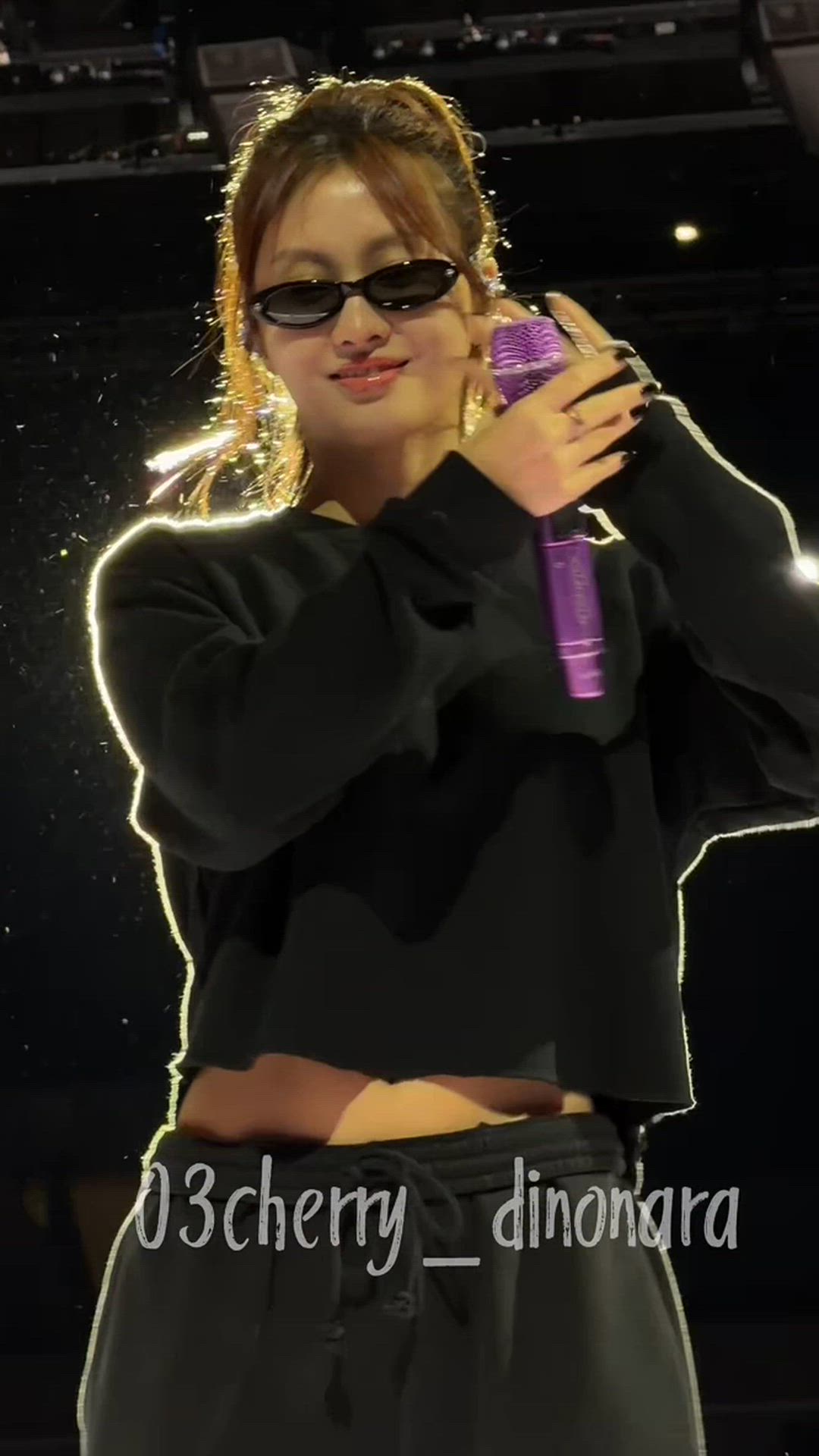 Momo presents a comfortable yet stylish stage outfit featuring a trendy style cropped sweatshirt paired with jogger pants. The all-black ensemble creates a chic and sophisticated vibe, while the cat-eye sunglasses add an edgy touch. This look is suitable for active performances, completing a fashion statement that embraces a luxury casual aesthetic.