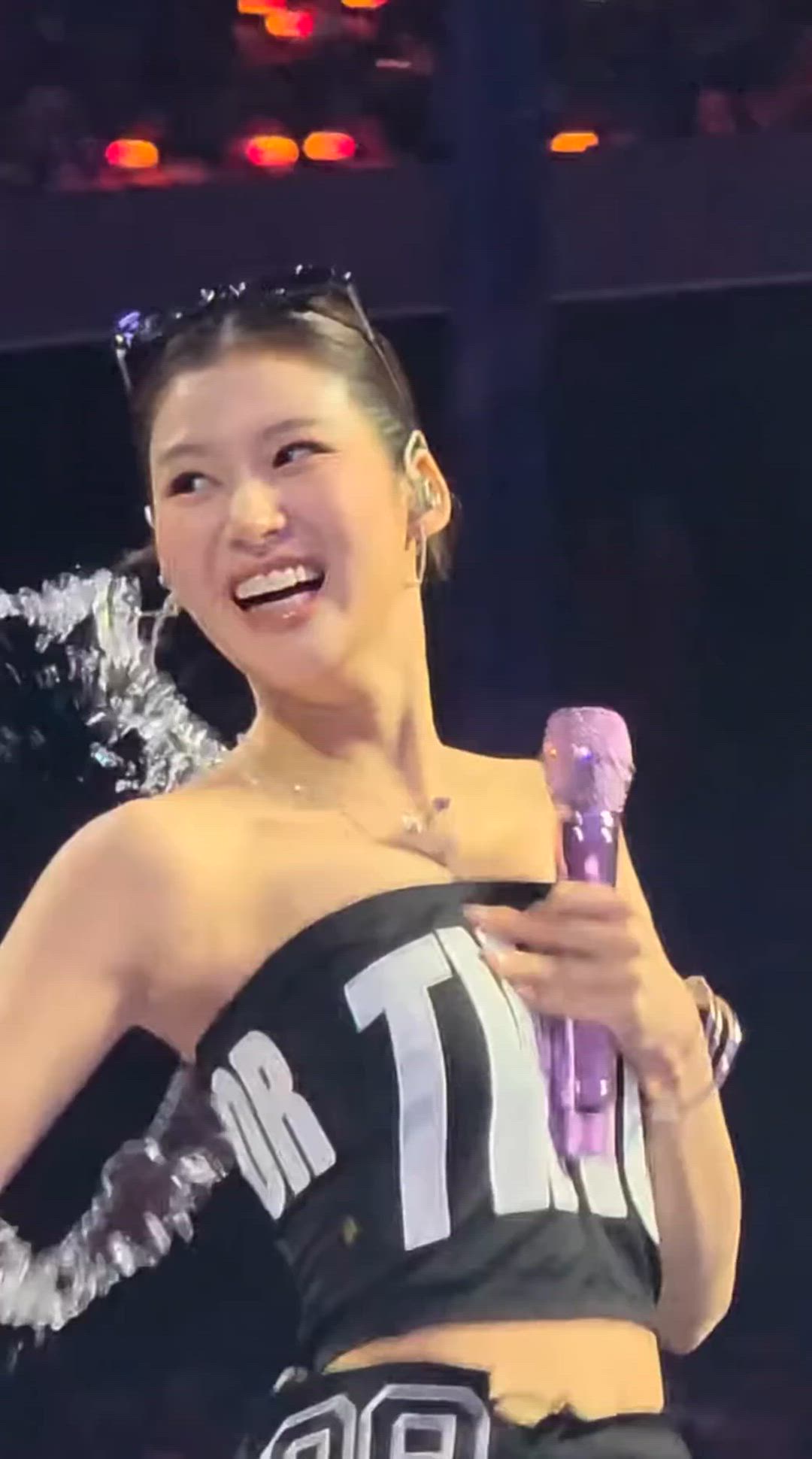 TWICE 사나는 활기 넘치는 아이돌 무대 의상을 선보입니다. 블랙 크롭 튜브톱과 매치되는 하의로 구성된 의상은 역동적인 퍼포먼스에 최적화된 스타일입니다. 특히 반짝이는 실버 컬러의 암 액세서리와 섬세한 목걸이로 포인트를 주어 글램 코어 스타일의 매력을 더하고 있습니다. 전반적으로 트렌디하면서도 편안함을 강조한 캐주얼한 룩을 연출하고 있습니다.