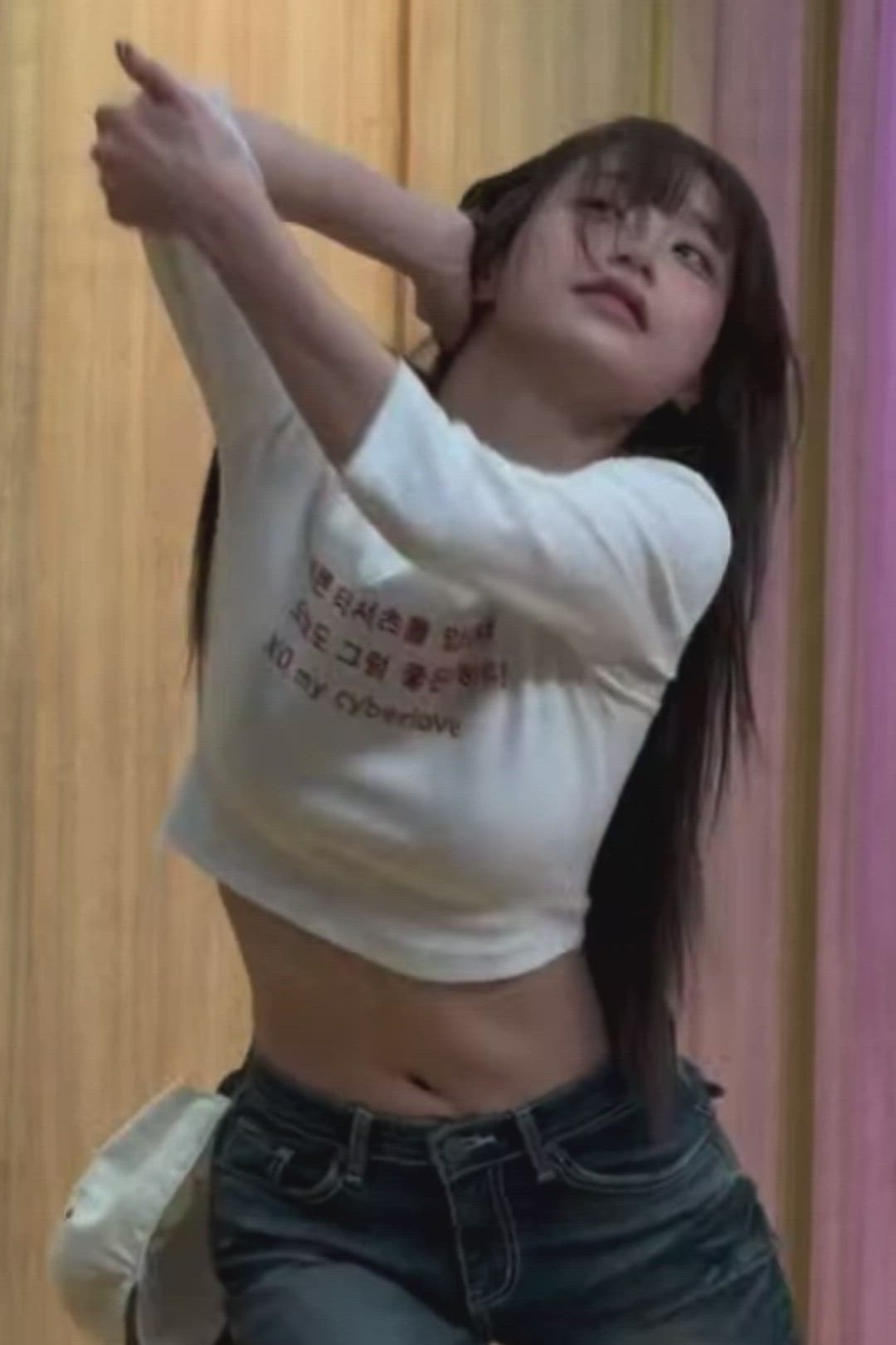 흰색 긴팔 크롭탑을 착용했습니다. 몸에 살짝 피트되는 슬림핏이며, 배꼽 위로 올라오는 짧은 기장으로 활동적인 느낌을 줍니다. 가슴 부분에는 레드 컬러의 한글과 영문(XO my cyberlove) 레터링 프린팅이 있어 캐주얼한 포인트를 더합니다. 면이나 코튼 혼방 소재로 제작되어 편안한 착용감이 특징입니다. KIRSHADER ERROR와 같은 브랜드에서 이와 유사한 그래픽 크롭탑을 찾아볼 수 있습니다.