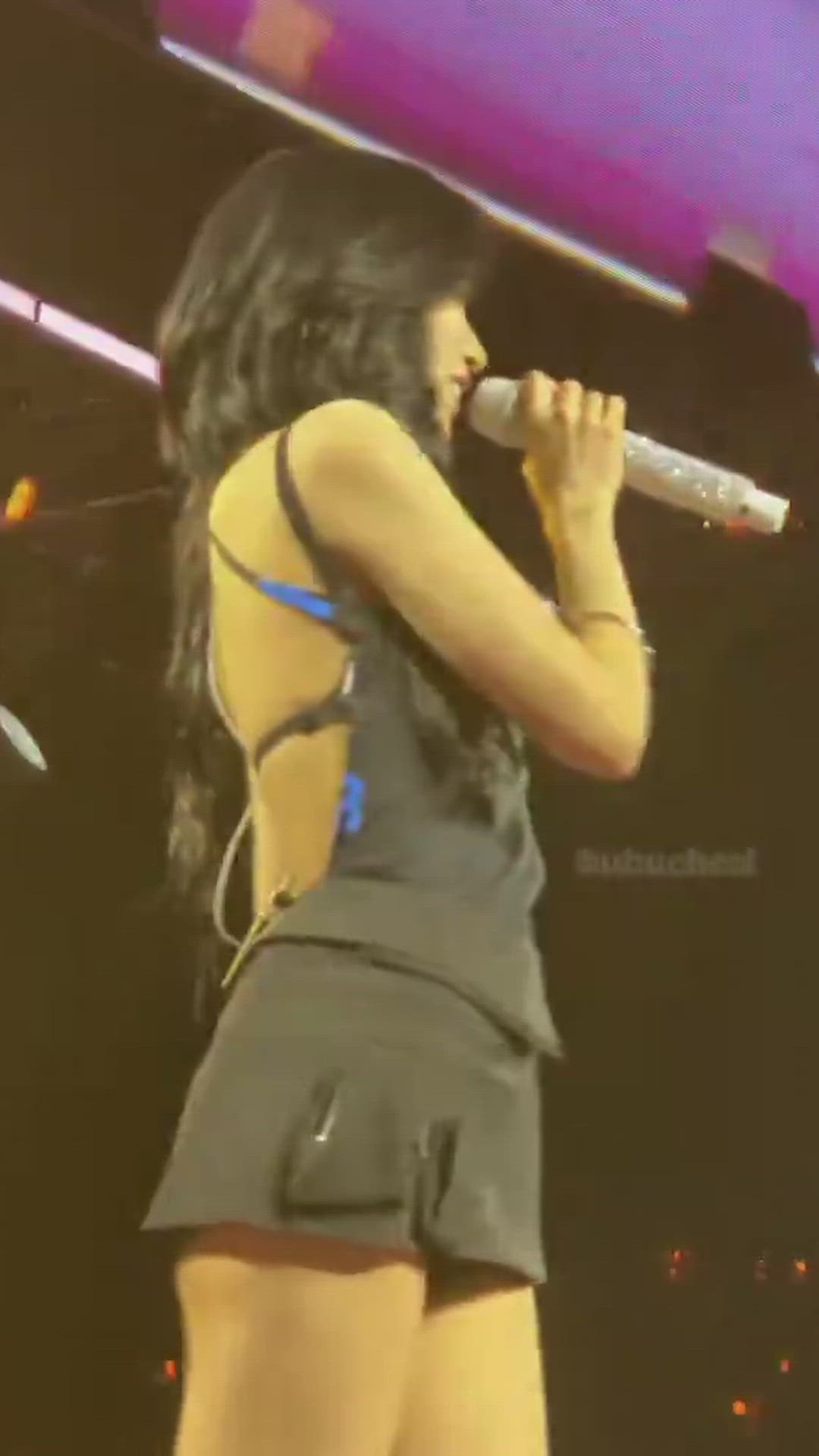 Mina is wearing a black sleeveless top. This top features a deep backless design, with thin shoulder straps and blue straps crossing at the back, adding a stylish detail. It has a comfortable yet active fit, suitable for a stage outfit, and appears to be made from a lightweight synthetic fiber or cotton blend to enhance mobility. Similar chic top designs can be found from brands like AllSaints or Reformation.
