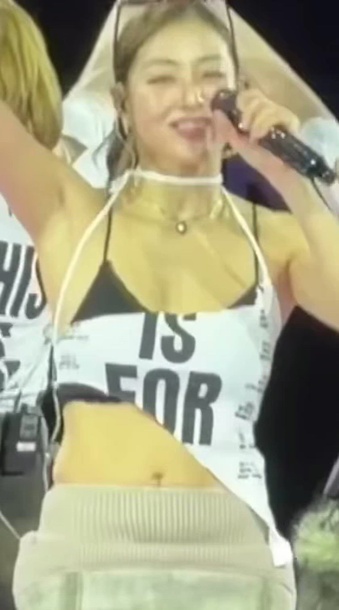 지효는 무대 위에서 디컨스트럭티드된 상의와 편안한 하의를 매치하여 스테이지룩을 선보이고 있습니다. 과감한 블랙 브라톱 위에 흰색의 비대칭 크롭 탑을 레이어드하여 컨템포러리하고 개성 있는 스타일을 연출했습니다. 전체적으로 활동적이면서도 시선을 사로잡는 매력이 돋보이는 의상입니다.