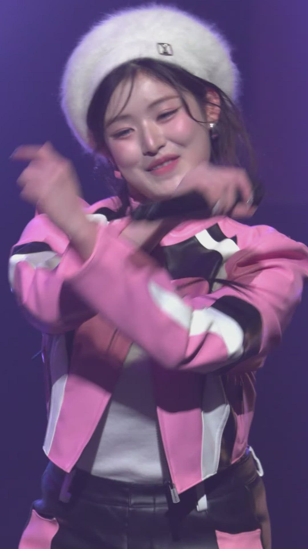 Athena는 핑크색 레이싱 자켓과 레더 쇼츠를 매치하여 강렬하면서도 스타일리시한 분위기를 연출합니다. 화이트 베레모와 볼드한 링 귀걸이 등의 패션 아이템을 더해 전체적으로 힙하고 감각적인 스트리트 패션 스타일을 완성합니다. 발랄하면서도 엣지 있는 무대가 돋보이는 착장입니다.