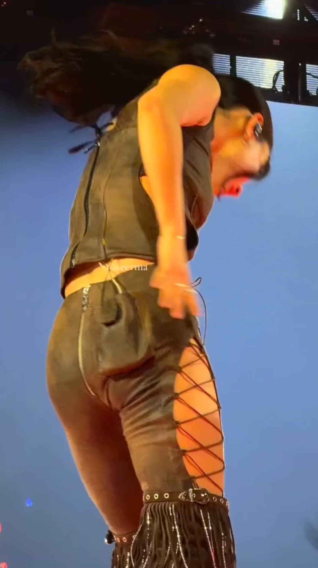 TWICE's Jihyo presents a bold and intense style, perfectly suited for performance wear. She wears an all-dark ensemble, creating a chic and edgy vibe. The cropped top, seemingly made of leather, and the unique lace-up detail on the sides of the bottoms particularly highlight Jihyo's charismatic stage presence. A metallic fringed belt around her waist adds a touch of glamour with every movement, serving as a powerful focal point in this striking leather apparel look.