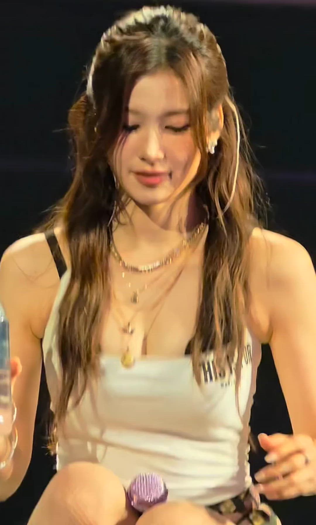 TWICE Sana showcases the epitome of idol styling with a trendy stage outfit. This concert fashion creates a comfortable yet distinctive ambiance, emphasizing her active charm by pairing a white crop tank top with uniquely patterned bottoms. She enhances the overall look with multiple layered jewelry pieces, adding a touch of sophistication.
