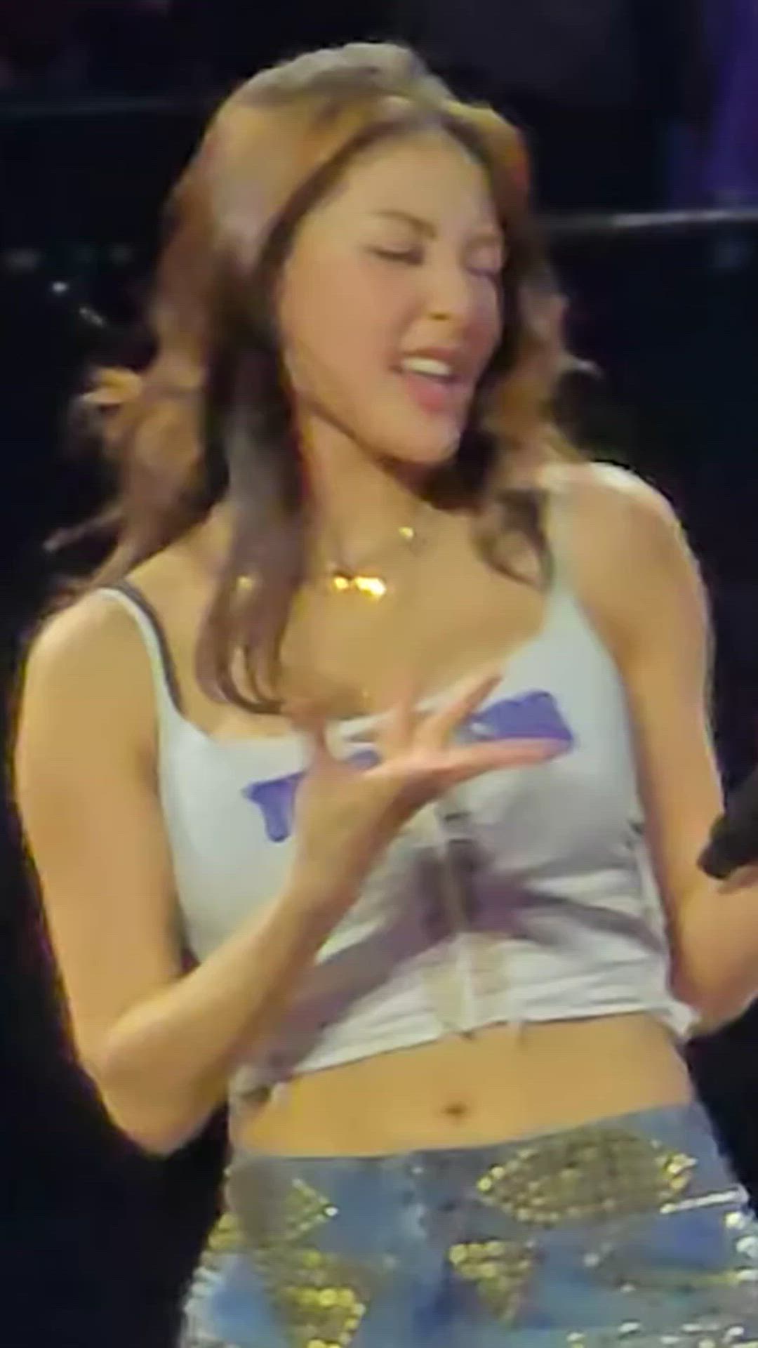 흰색 크롭 탱크톱을 착용하고 있습니다. 얇은 어깨 스트랩과 몸에 적당히 붙는 핏이 특징이며, 전면에 보라색 또는 파란색 그래픽 디테일이 있습니다. 무대 위에서 활동적인 움직임을 고려한 디자인으로 보입니다.